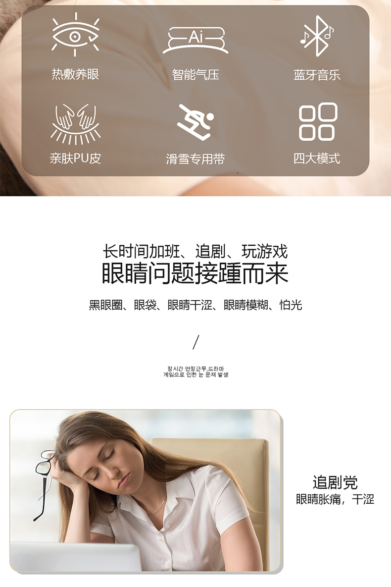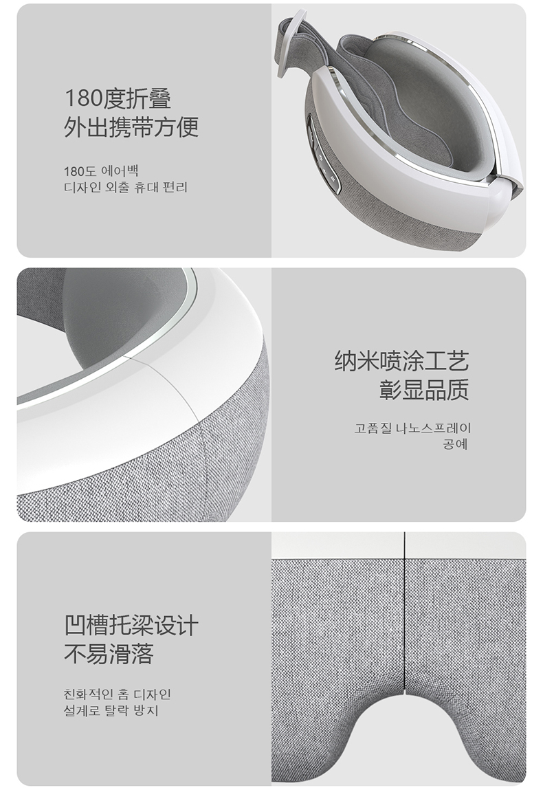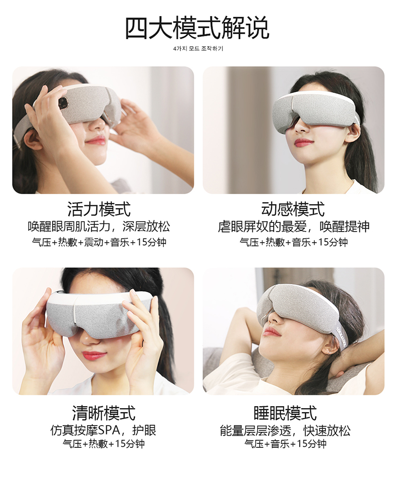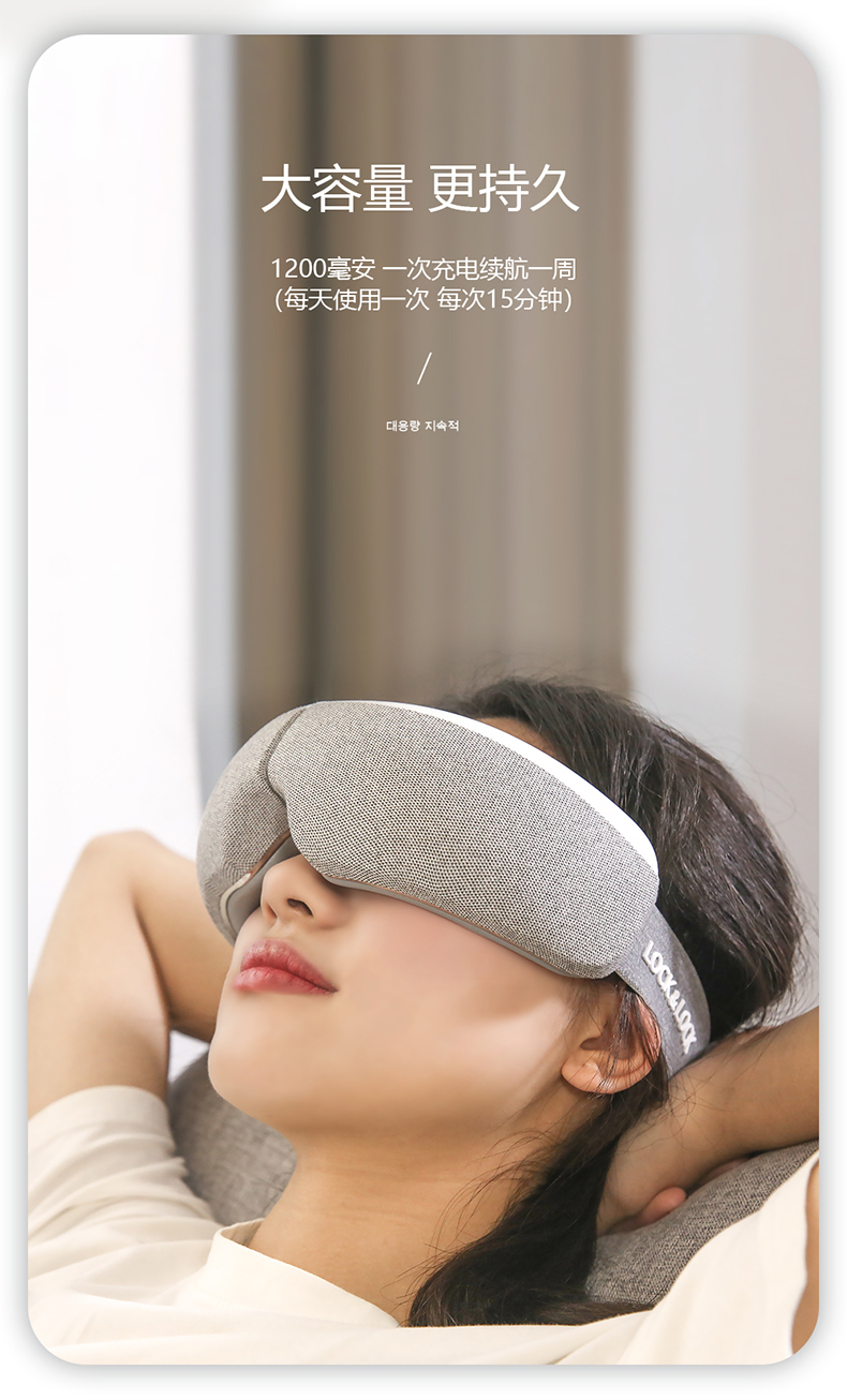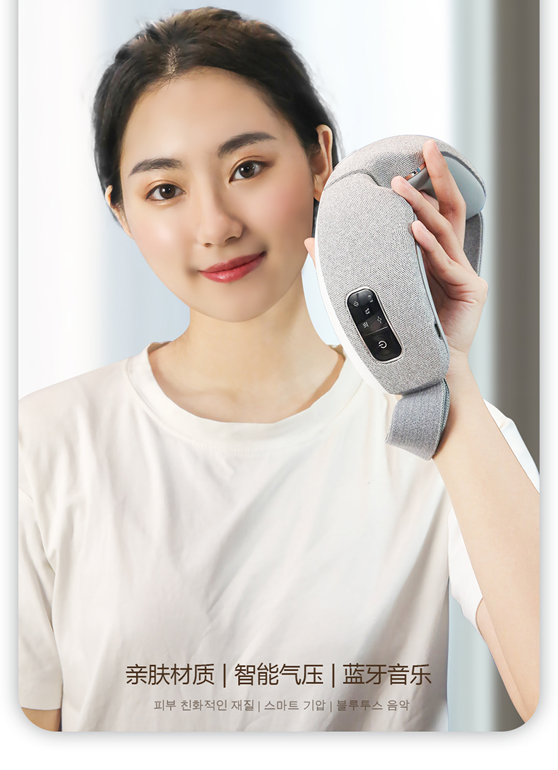 全气囊包裹,根据眼部轮廓多组气囊均匀分布,定点分布在太阳穴、鱼腰穴、攒竹穴等重要穴位,双马达的配置让按摩力度更均匀,模拟推拿、颤动、锤击、指压、滚转等六种传统按摩手法, 促进血液循环,使睫状肌、六条肌增加弹性,缓解眼球酸涩胀痛,增加眼球活力,按摩更到位。