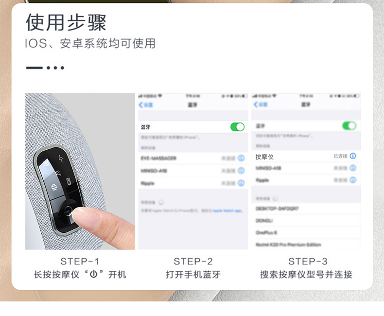 自带语音提示,老人小孩也能轻松操作。支持蓝牙连接,听音乐、听小说,舒缓放松身心,带来舒适按摩体验。内置1200毫安聚合物锂电池,每天2次,每次15分钟,约可使用一周时间。居家,办公、旅行任何场景都有可以无拘束的佩戴。