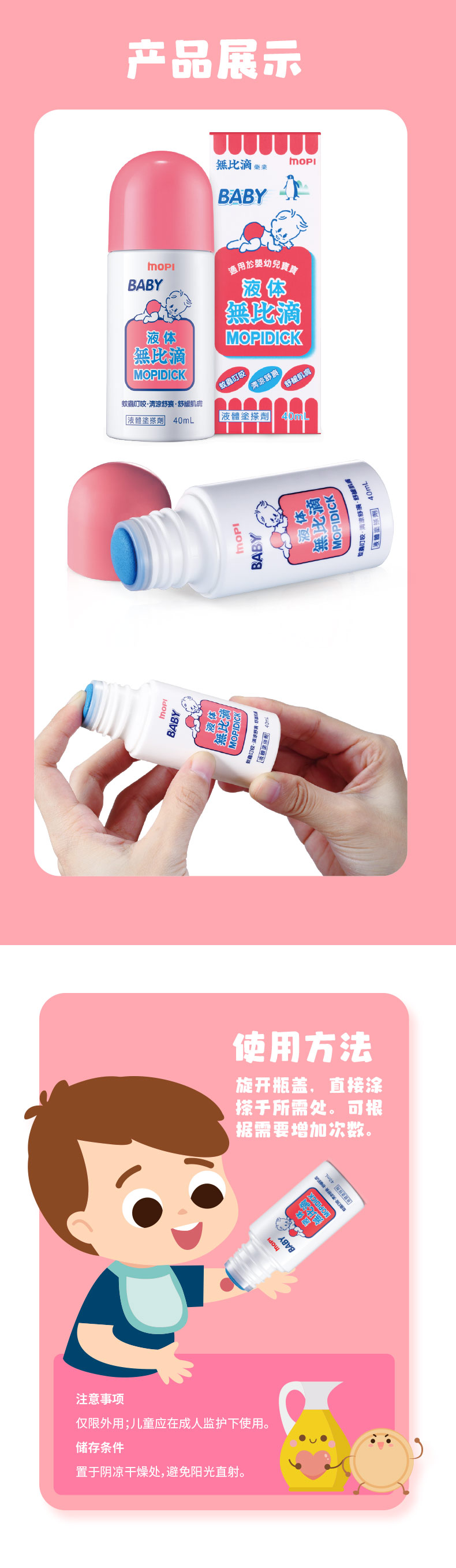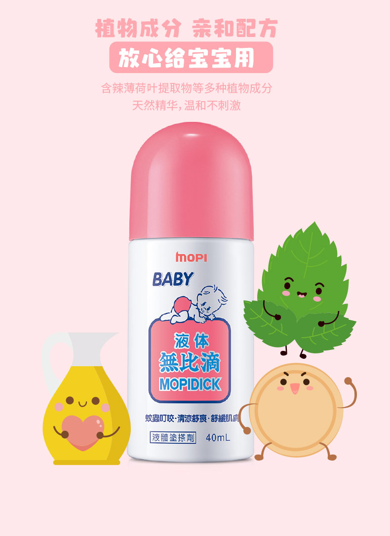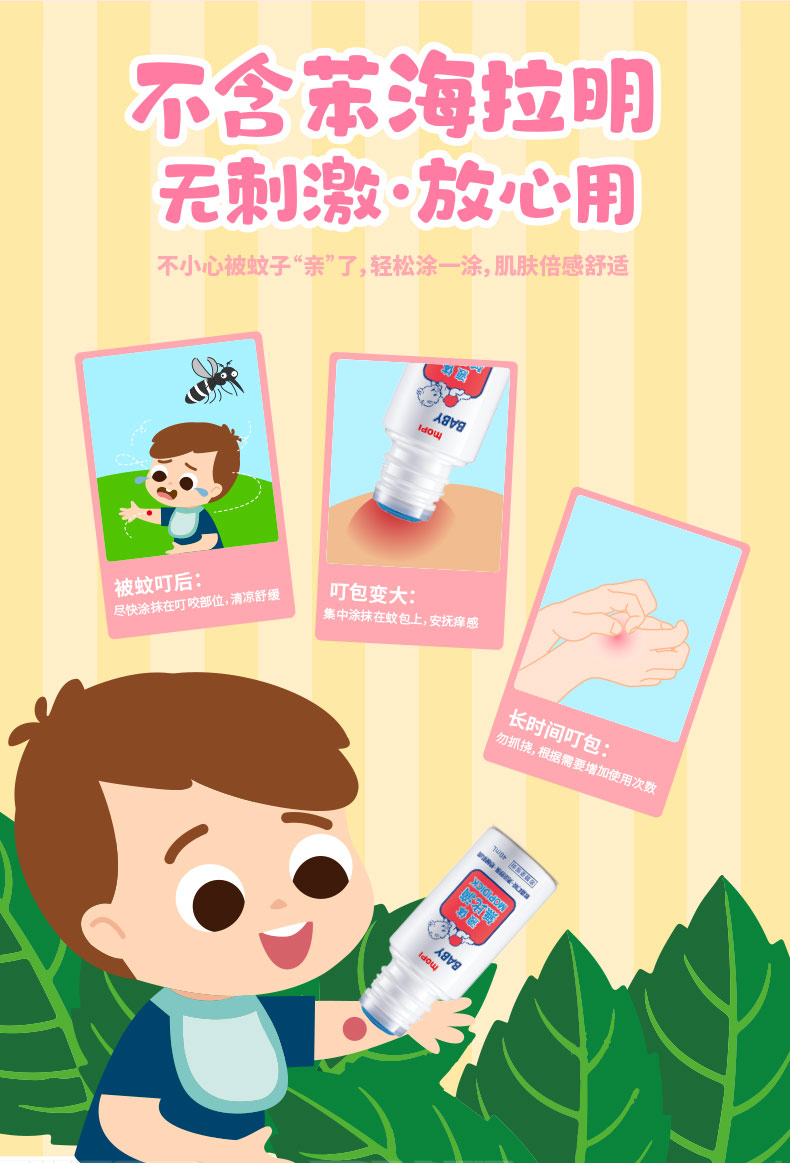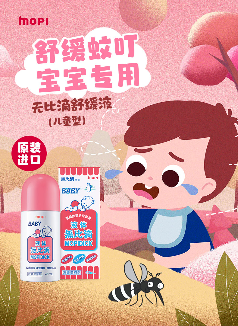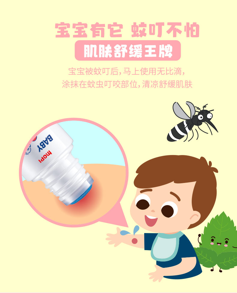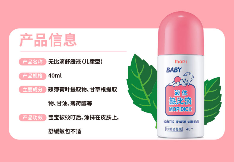 池田模范堂「官网」 无比滴是日本最畅销的液体蚊虫叮咬治疗药。本品快速地渗入骚痒部位,可迅速止痒,对肿胀、红肿有很好疗效。使用起来感觉清爽不油腻的,带有温和香草味。不脏手的涂布栓瓶口,开盖后,将瓶的头部在皮肤上按压几次,让药液充分渗透到胶头部后,可以快速涂抹,使用非常方便。