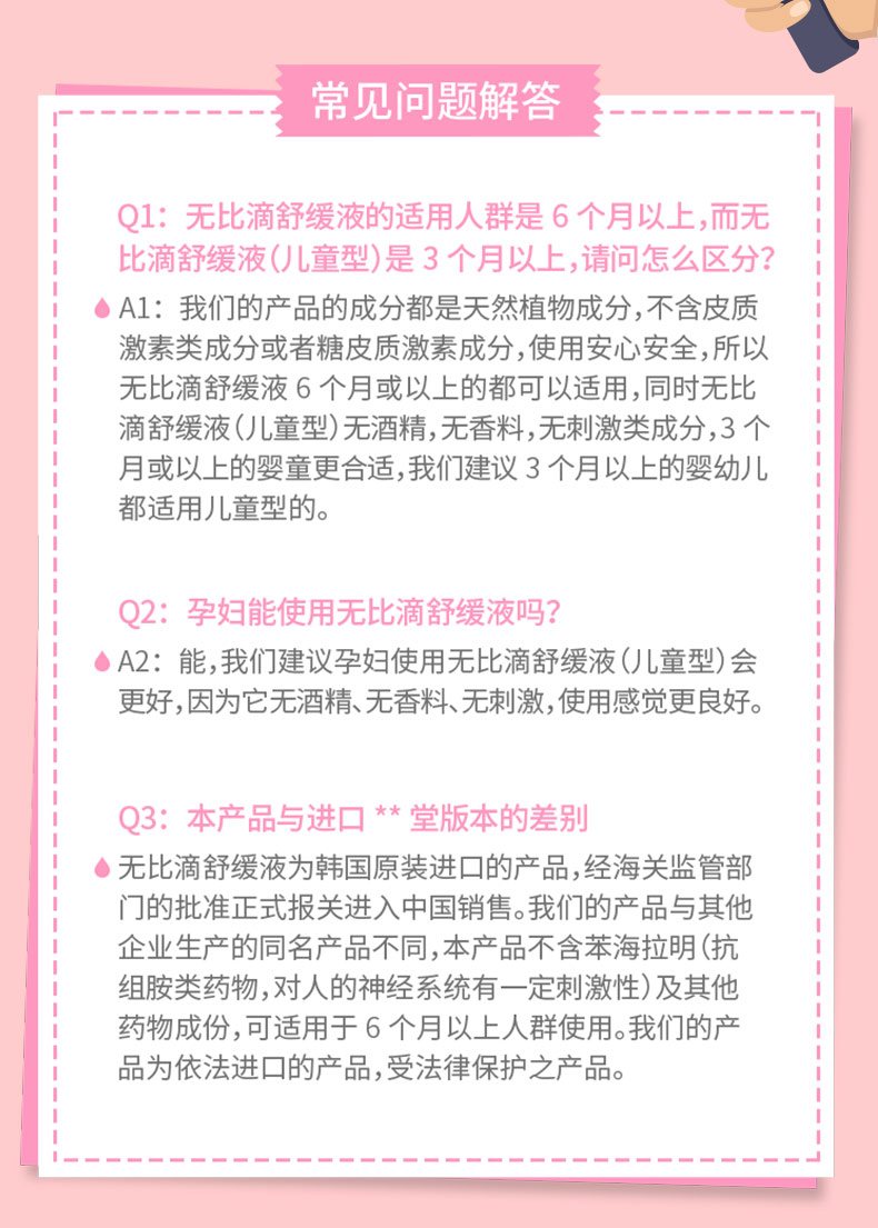 适宜人群:3个月以上儿童及孕妇都可使用,哺乳期也能用,敏感肌也可使用。脸部可以使用。