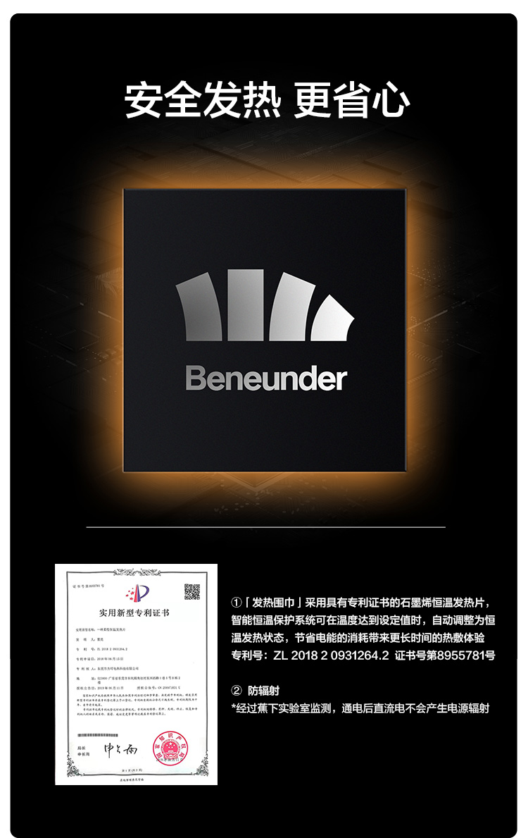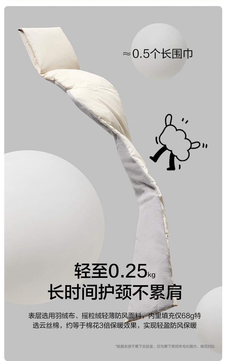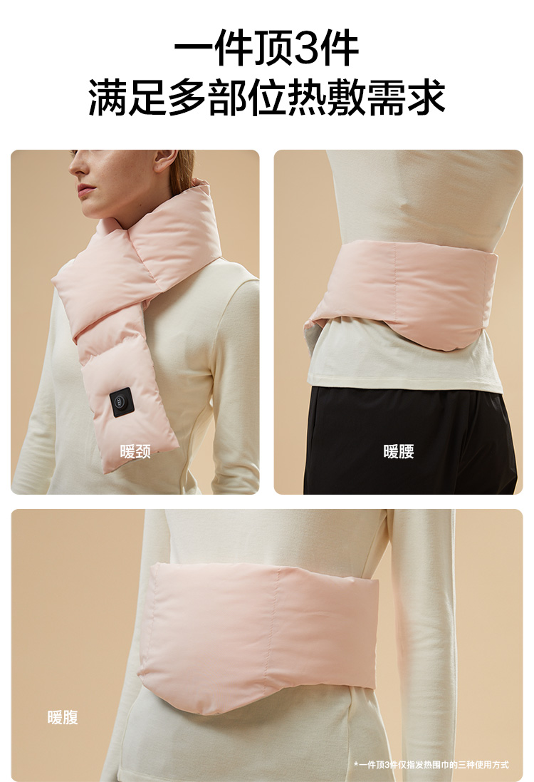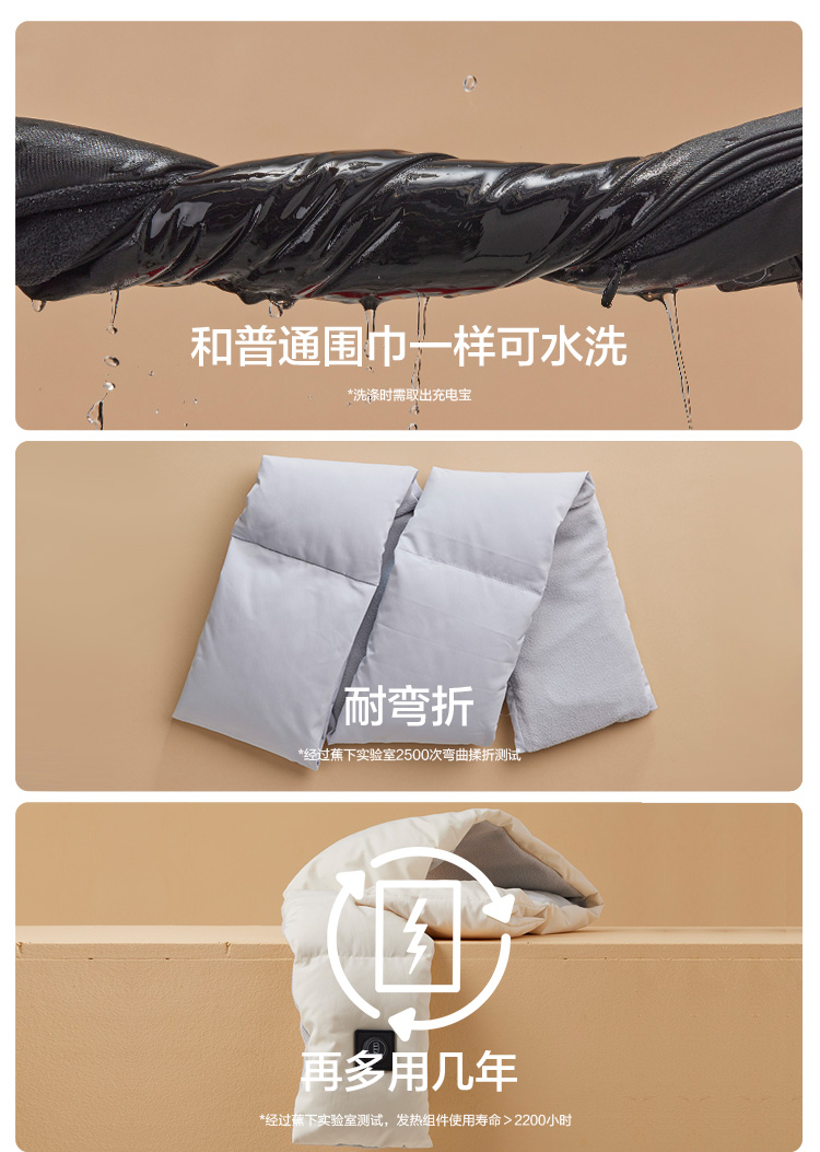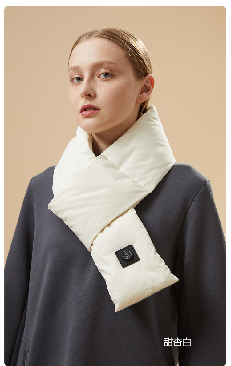 细节上:人体工程学设计包裹整个颈部,紧密贴合,佩戴舒适。双重面料:外层羽绒布防风防泼水,内里摇粒绒柔软贴合肌肤,围巾内里填充云丝棉,超轻保暖实现长时间锁温效果。耐弯折可水洗,内置2500mAh锂电池,可支持长久供电。