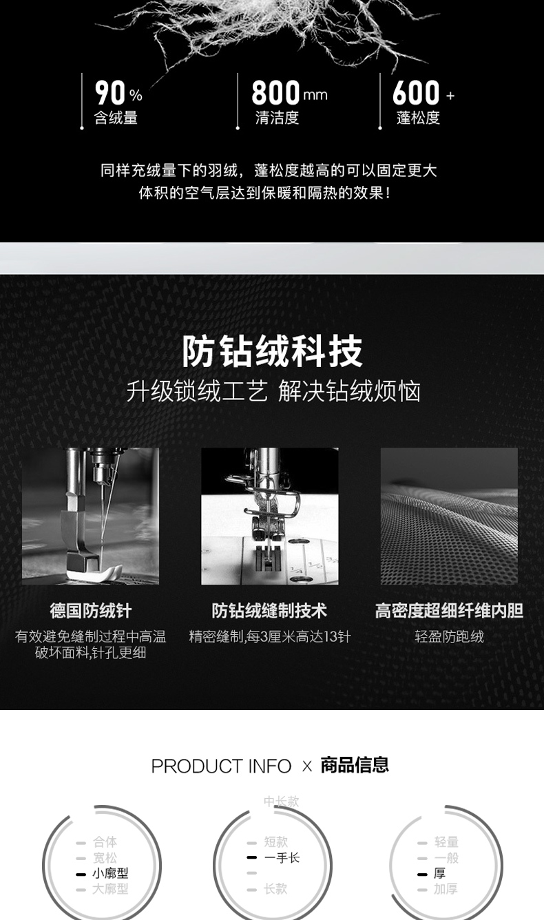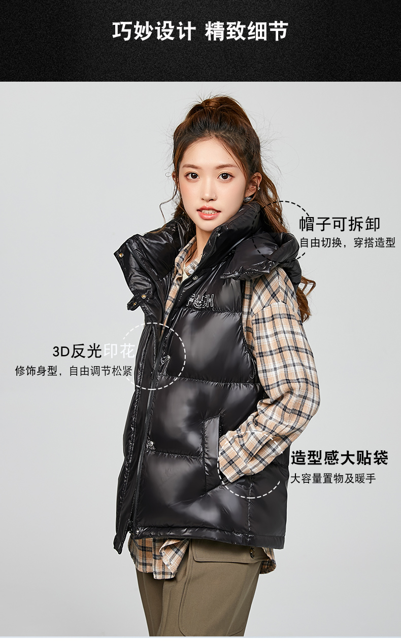 甄选高品质90白鸭绒填充,600+高蓬松度,800mm洁净度,健康环保,穿着身形不臃肿,帽子可拆卸设计,自由切换百搭造型,身体两侧大容量插袋,置物暖手贴心方便。