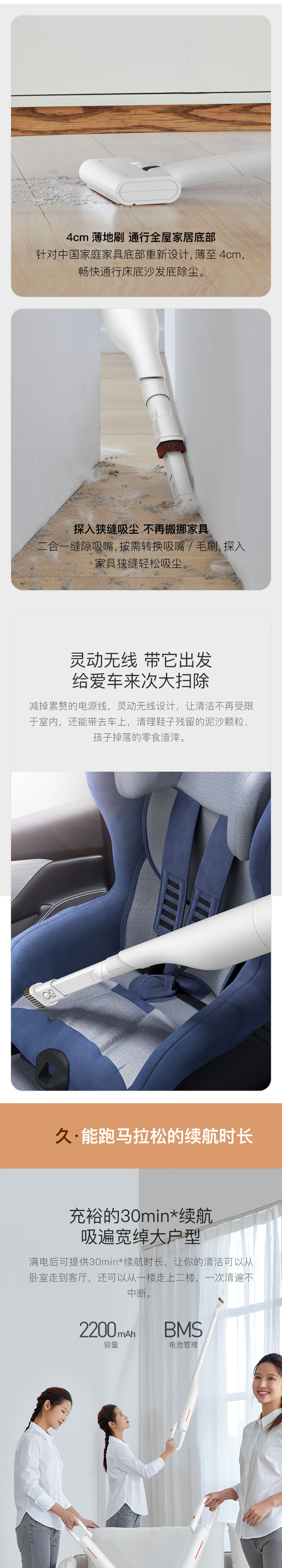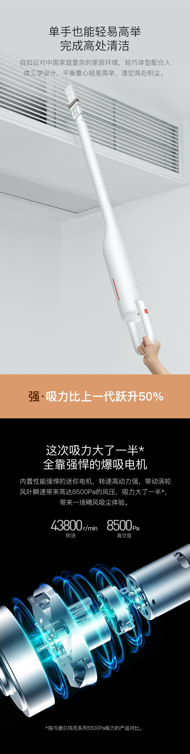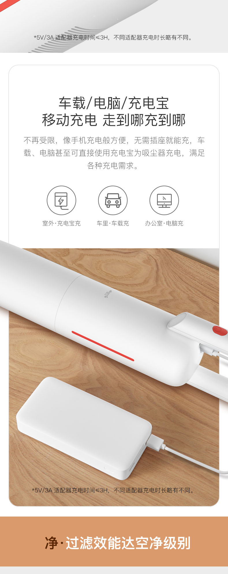 内置性能强悍的迷你电机,带动涡轮风叶瞬速带来高达8500Pa的风压,真空度可达8500Pa,相比上一代吸力提升约50%;实验搭配吸盘测试可轻松提起50斤箱子,配有二合一扁吸头、地刷、内置2200mAh锂电池,满电后能提供30分钟续航,无线使用更灵动,车载、电脑、充电宝可直接为其充电,非常方便。