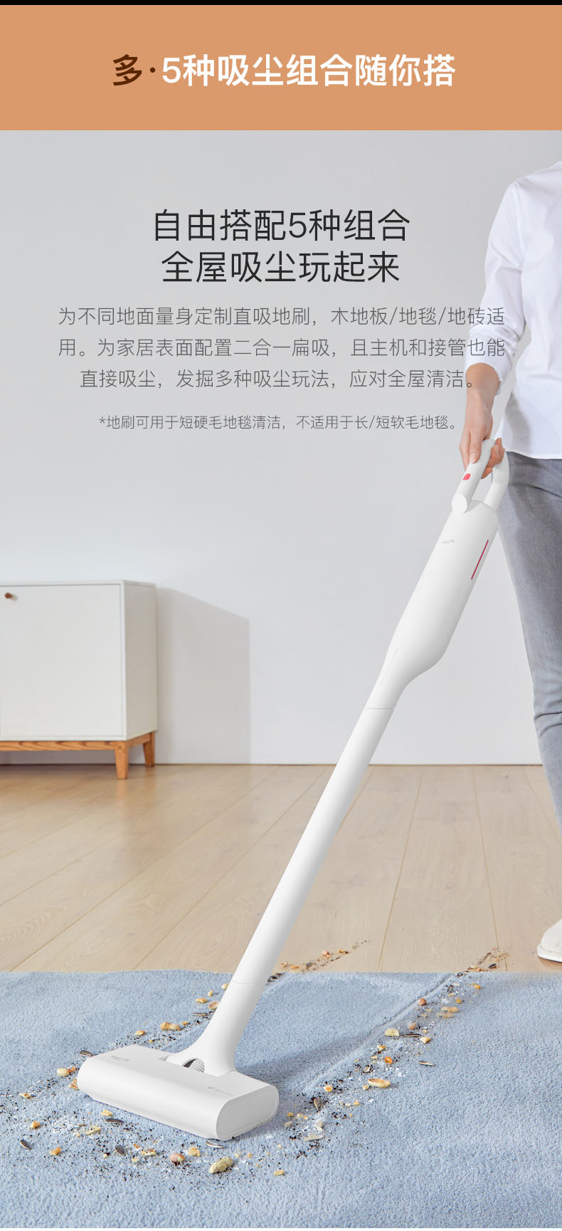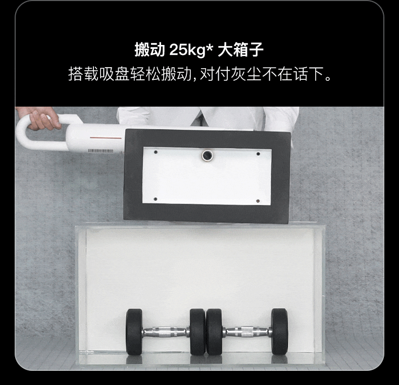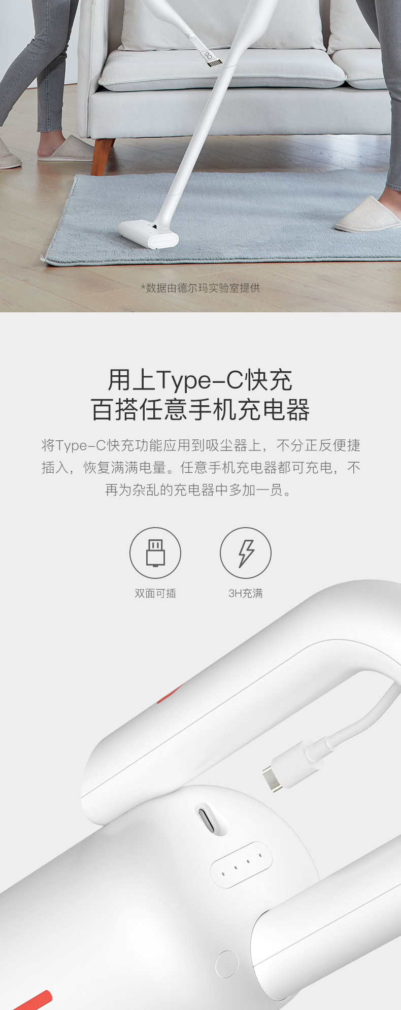 内置性能强悍的迷你电机,带动涡轮风叶瞬速带来高达8500Pa的风压,真空度可达8500Pa,相比上一代吸力提升约50%;实验搭配吸盘测试可轻松提起50斤箱子,配有二合一扁吸头、地刷、内置2200mAh锂电池,满电后能提供30分钟续航,无线使用更灵动,车载、电脑、充电宝可直接为其充电,非常方便。
