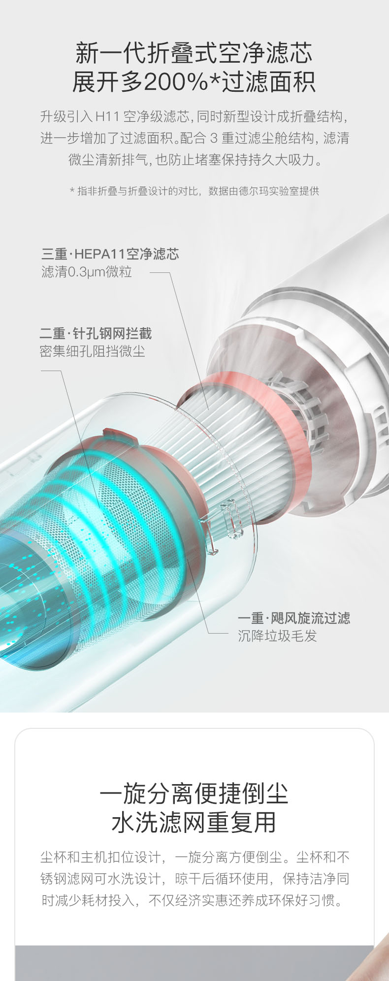 细节上:升级引入H11空净级滤芯,新型折叠结构,展开过滤面积约提升了200%,配合3重过滤尘舱结构,滤清微尘清新排气,也防止堵塞保持持久大吸力。