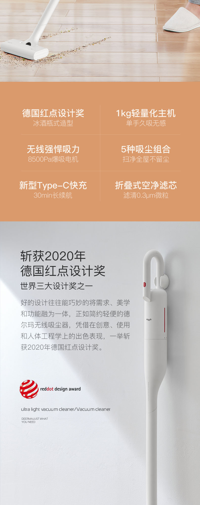 天猫德尔玛旗舰店499元,可领220元优惠券,实付279元到手,荣获了红点设计奖,德尔玛 超轻无线吸尘器,简约时尚集功能美学于一体,主机仅2斤的超轻量化设计,女性朋友,和老年人群均可单手轻松操作。