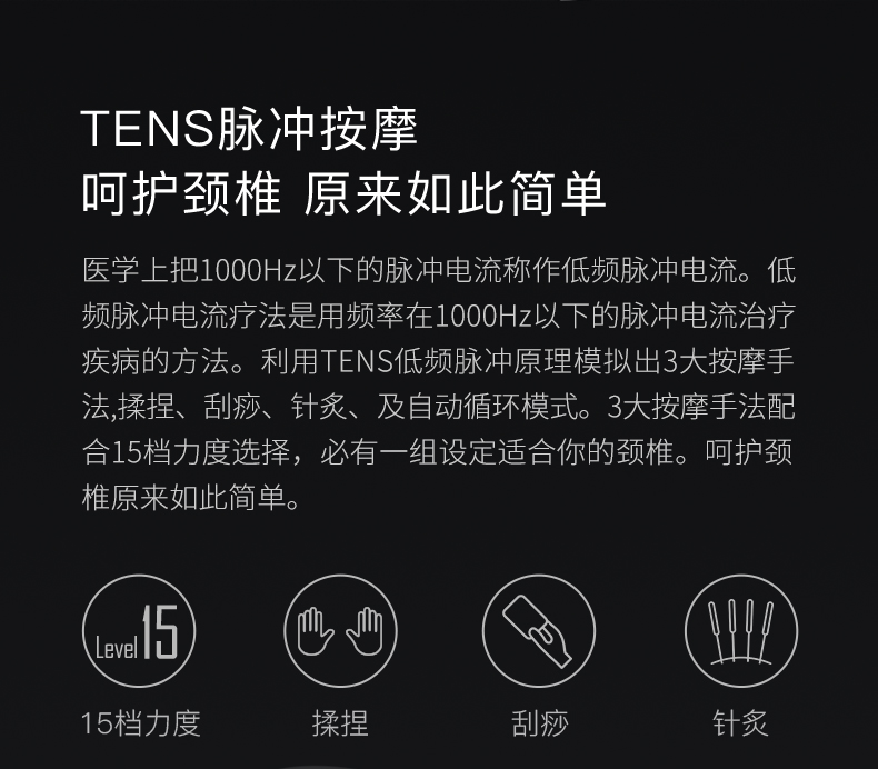 采用TENS脉冲技术利用特定频率的脉冲电流模仿手法按摩,可以模拟出揉捏、刮痧、针灸三大按摩手法,并且配合15级的力度调节,加上42°恒温热敷功能,再配合热敷,达到促进血液循环、缓解疼痛等颈部