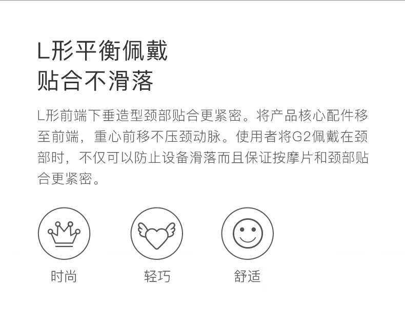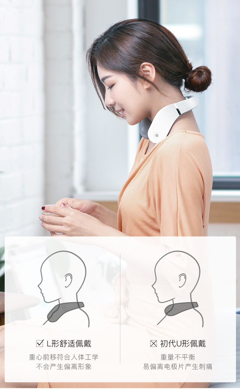 在使用方面, 还可以配合米家 APP 进行操作,具有记忆按摩功能。也支持遥控器操作,对长辈使用更友好。L型佩戴无论是抬头、低头还是扭头,电极片都能很好的贴合皮肤,不会有勒脖子的感觉,同时固定也很好,佩戴起来也格外舒适。