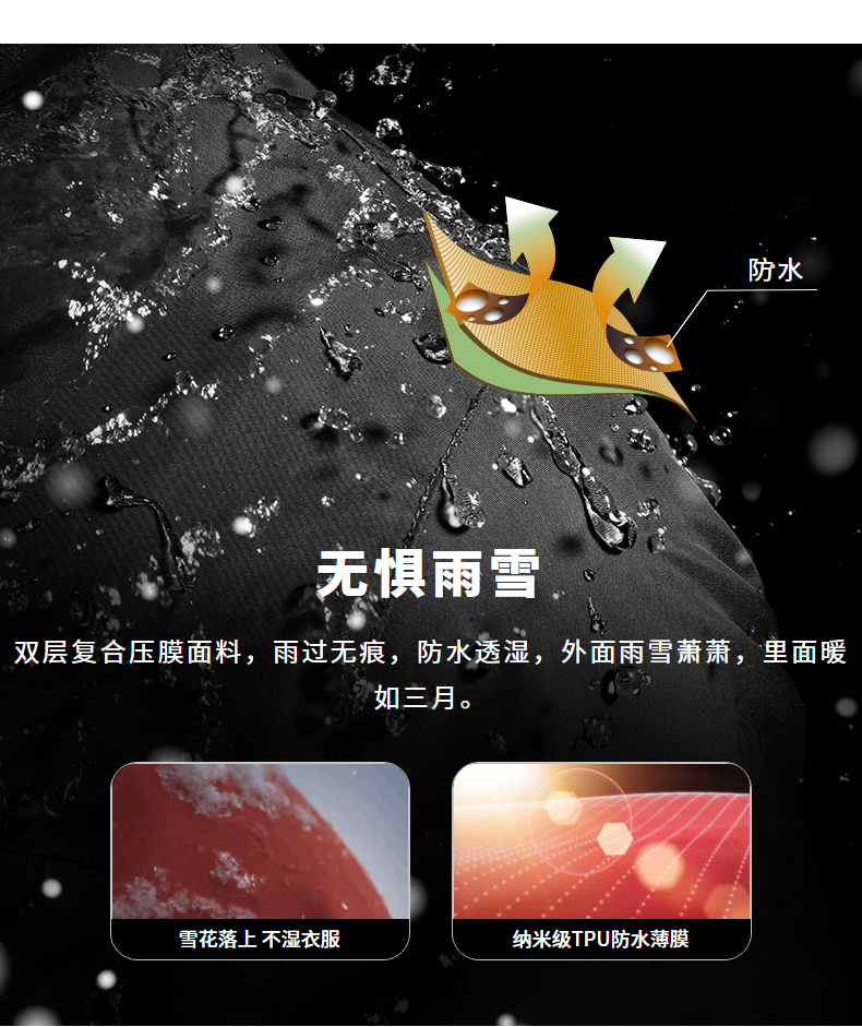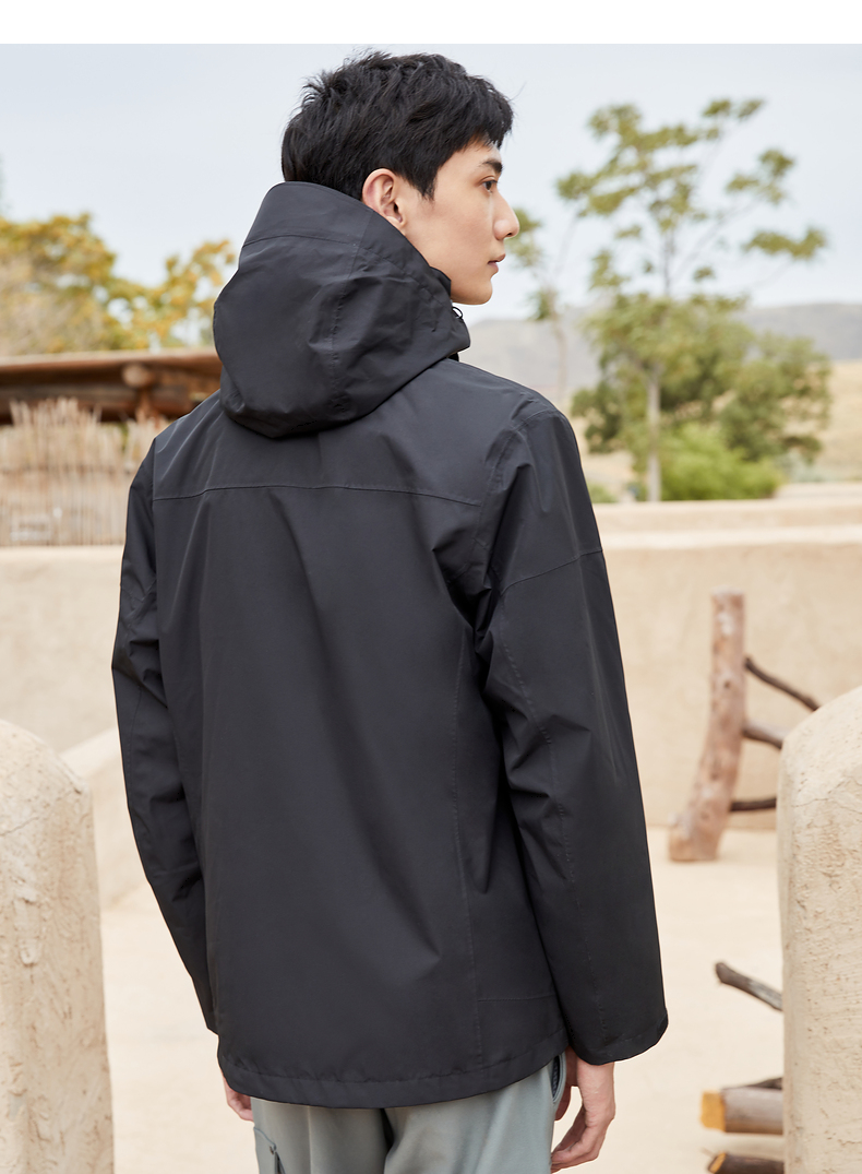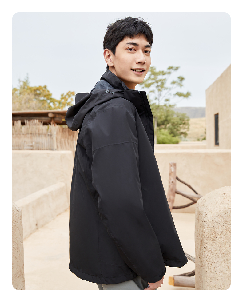 这款冲锋衣 三防科技面料,无惧大风、雨雪天气,面料双层复合压膜,纳米级TPU防水薄膜,具有良好的透气性,可快速导出湿热,久穿不闷热,过多次防油检验测试,杜绝油污附着、雨雪溅射,水珠、油渍、无法渗透面料,自清洁好打理。面料主要成分是锦纶,面料强度高,质地耐磨,不惧风沙颗粒及户外树枝的刮划。