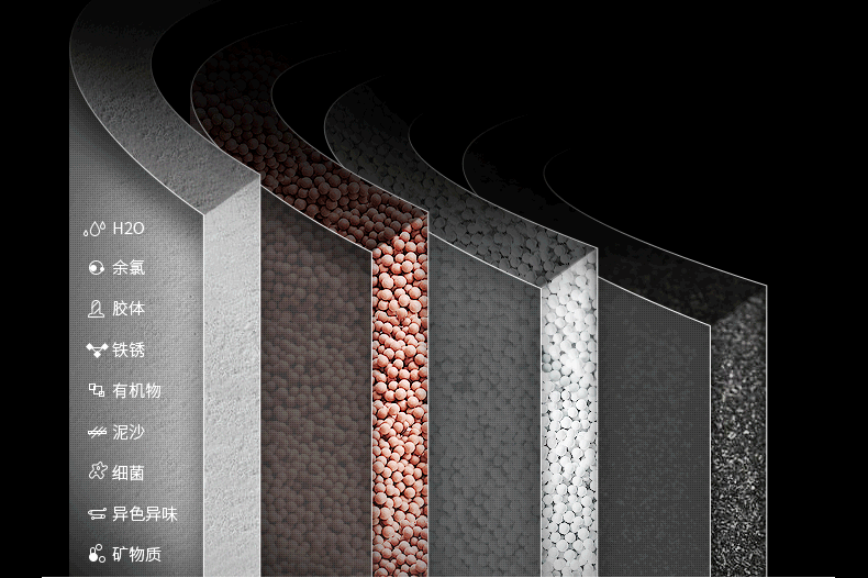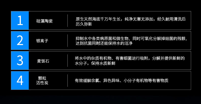天然硅藻泥陶瓷、、银离子抗菌材质、麦饭石、椰壳活性炭、4重过滤,可达到 0.1微米,有效滤除自来水中的泥沙、铁锈、胶体、余氯、异味等有害物质;使用ABS材质制作而成,防爆抗压,结实耐用;带有可拆卸设计,滤芯可以拿出来清洗,之后依然可以继续使用;并且带有双水切换,方便使用。