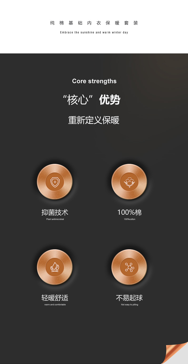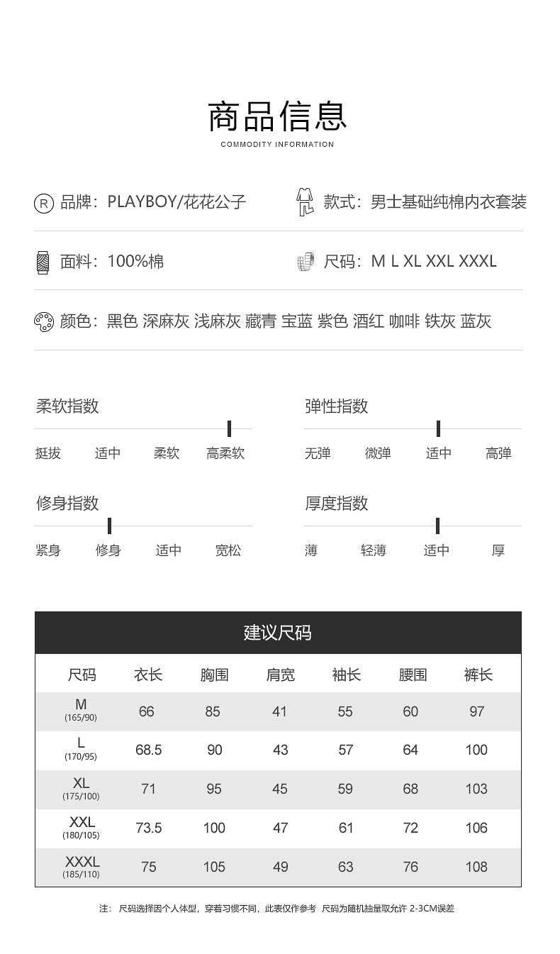 100%新疆纯棉面料,面料柔软细腻,触感顺滑,透气有弹性,不易起球,活性印染,一片式剪裁,3D人体工程学设计,穿着舒适不易变形,双包滚边圆V领,贴肤罗纹袖口及脚口,罗纹裤腰,无钮扣门襟,0感标签,不摩擦皮肤,拒绝刺痒,上身轻暖舒适。
