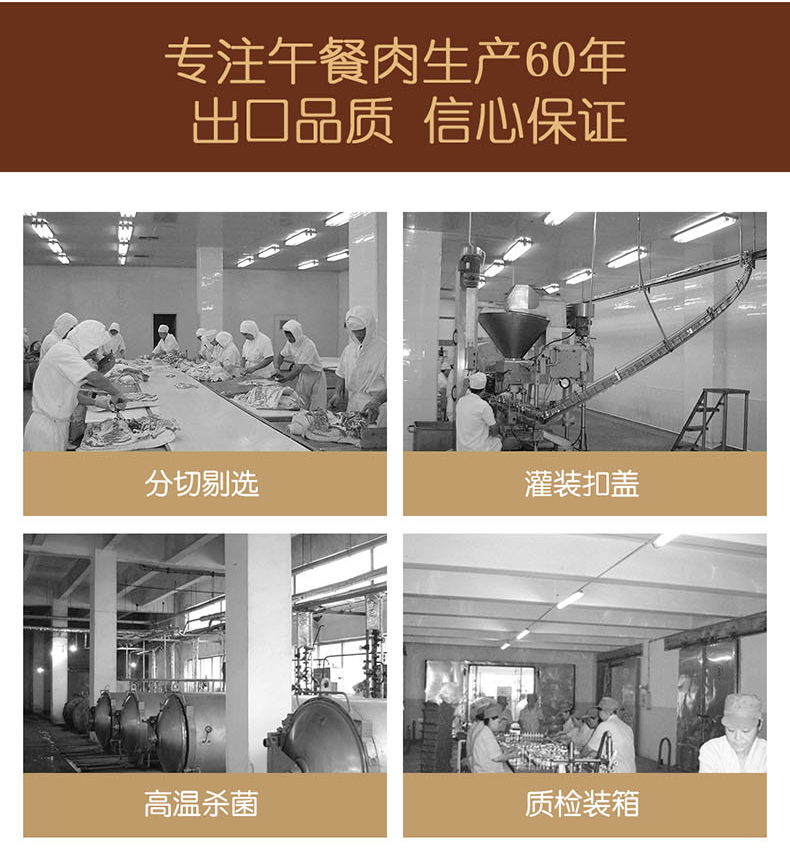 在传统午餐肉的基础上,融入西式精制火腿的制作工艺,优选具有国家检验检疫局认证的猪肉,只使用后腿精瘦肉,先腌后搅,改善口感的同时降低脂肪和热量,采用高温高压,杀菌熟化,食用安全健康。