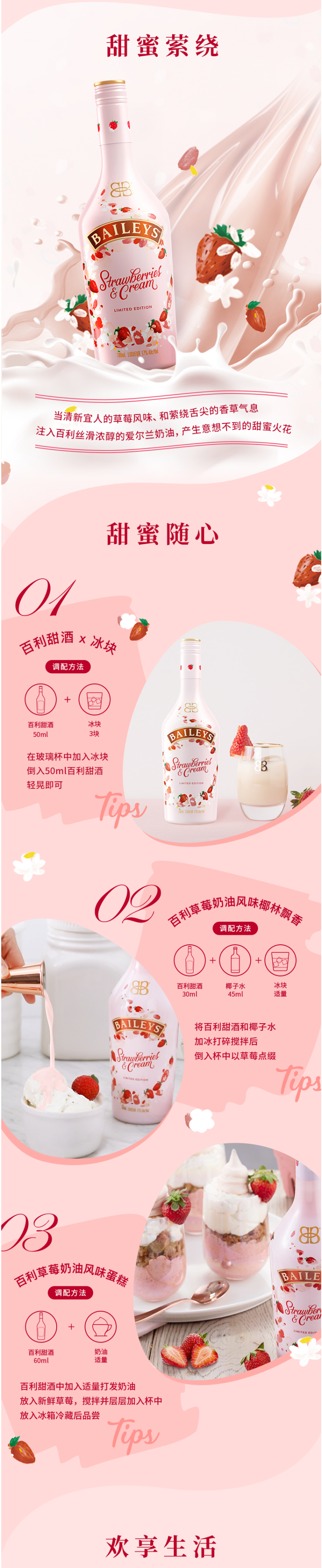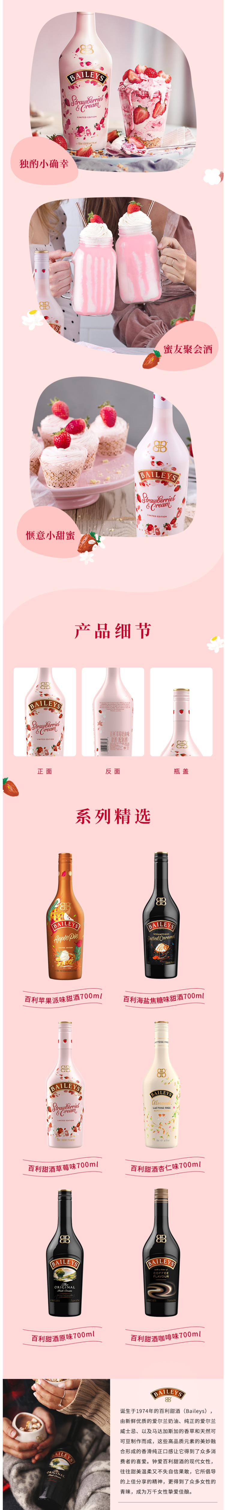 这款百利 Baileys草莓味甜酒,爱尔兰进口,酒精度17%,由蒸馏师挑选陈年三年以上的爱尔兰威士忌混合爱尔兰奶油经由独特工艺与精心调配而成,是一款弥漫着浓郁草莓气息的甜酒,口感馥郁香甜,适合加冰饮用,搭配各种甜点、冰淇淋等美味更增。