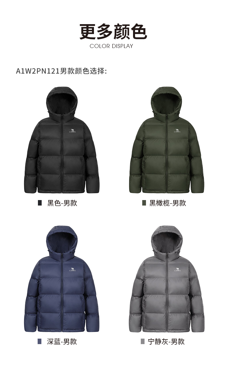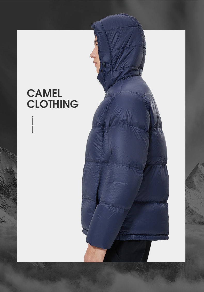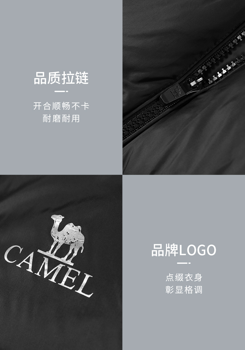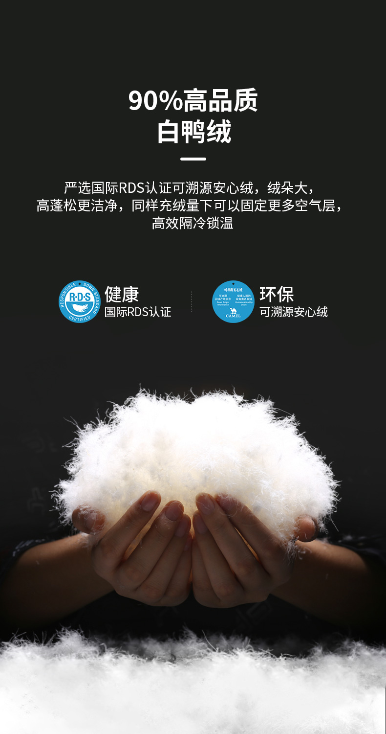 骆驼户外短款面包服,国际RDS认证高蓬松度大绒朵90白鸭绒,充绒量142-184g,女款117-165g相当于普通轻薄款式的2倍充绒量,均匀分格充绒,锁温保暖隔绝冷空气,约可抗-15℃左右寒冷天气。