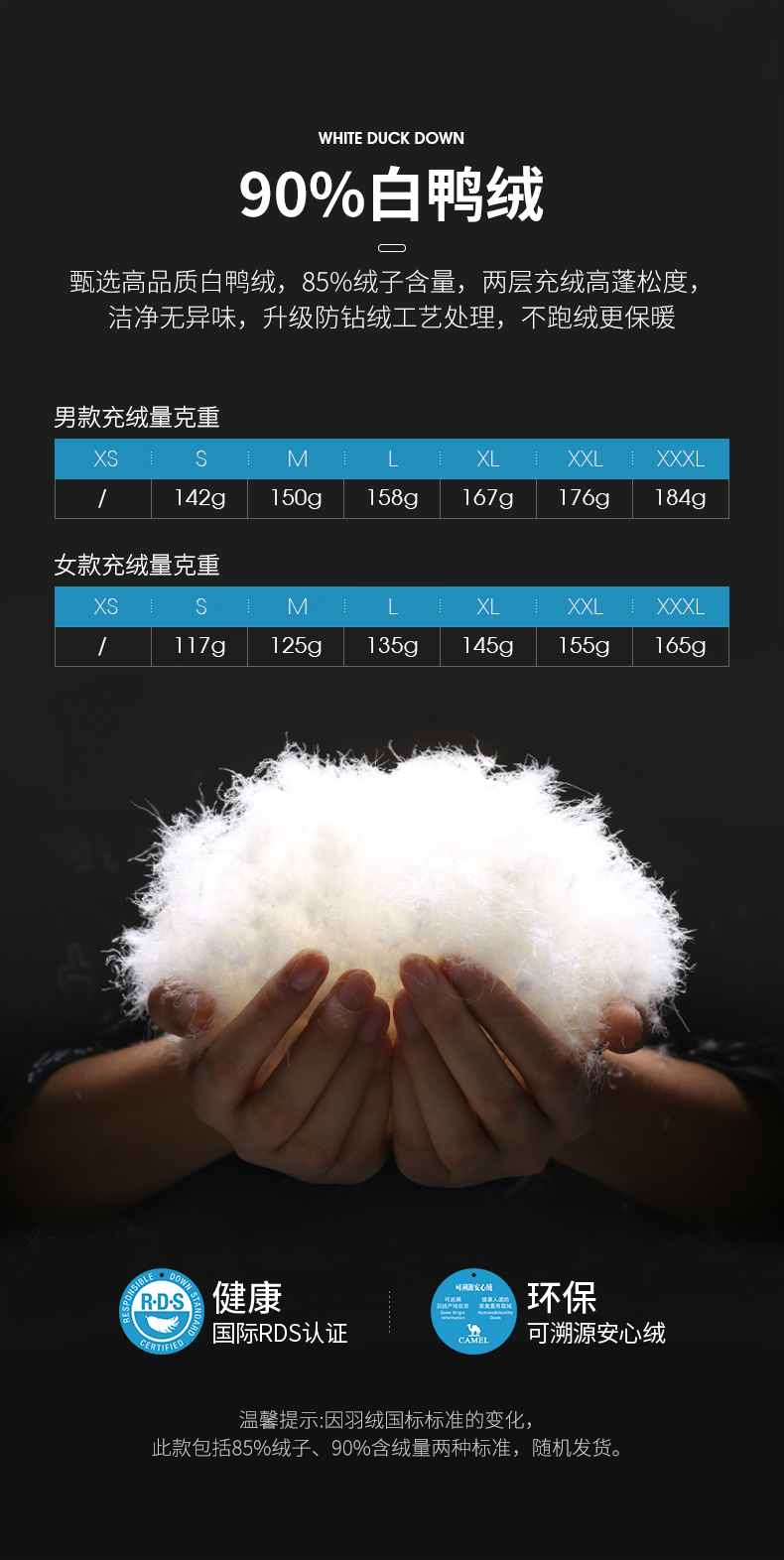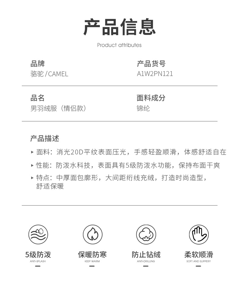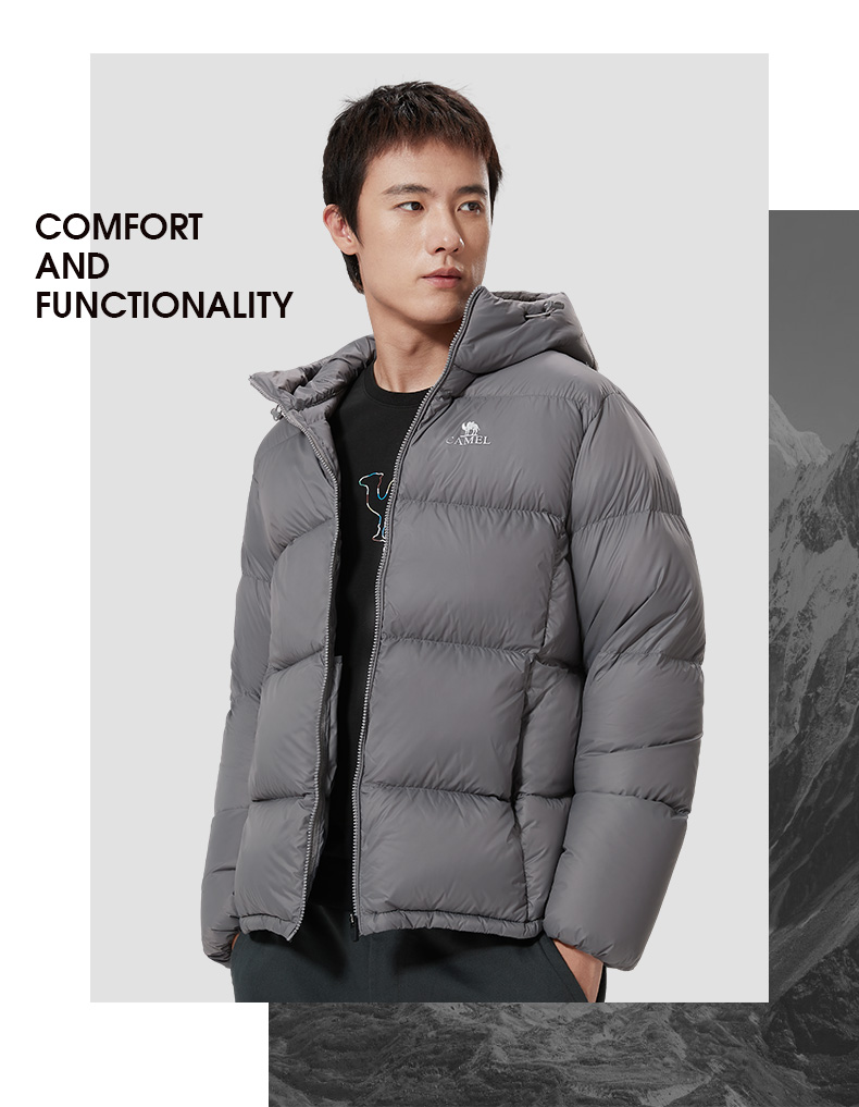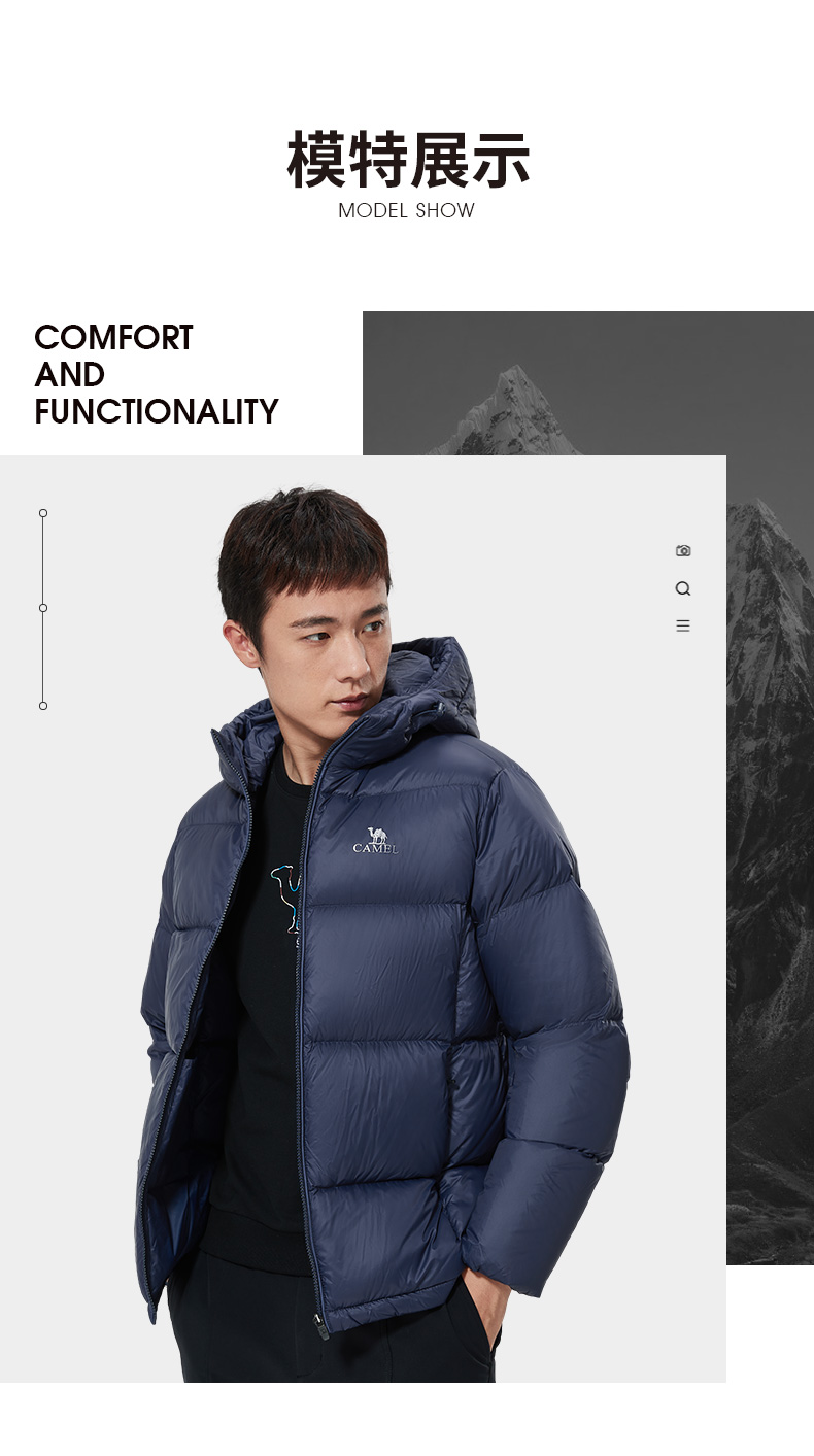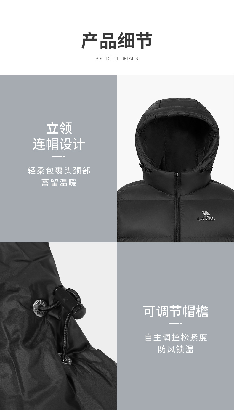骆驼户外短款面包服,国际RDS认证高蓬松度大绒朵90白鸭绒,充绒量142-184g,女款117-165g相当于普通轻薄款式的2倍充绒量,均匀分格充绒,锁温保暖隔绝冷空气,约可抗-15℃左右寒冷天气。