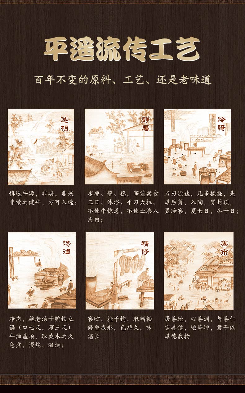 平遥牛肉,考究的选料和独特的腌、卤、炖、焖制作工艺,所产牛肉,色泽红润,肉质鲜嫩,肥而不腻,瘦而不柴,醇香可口,营养丰富。
