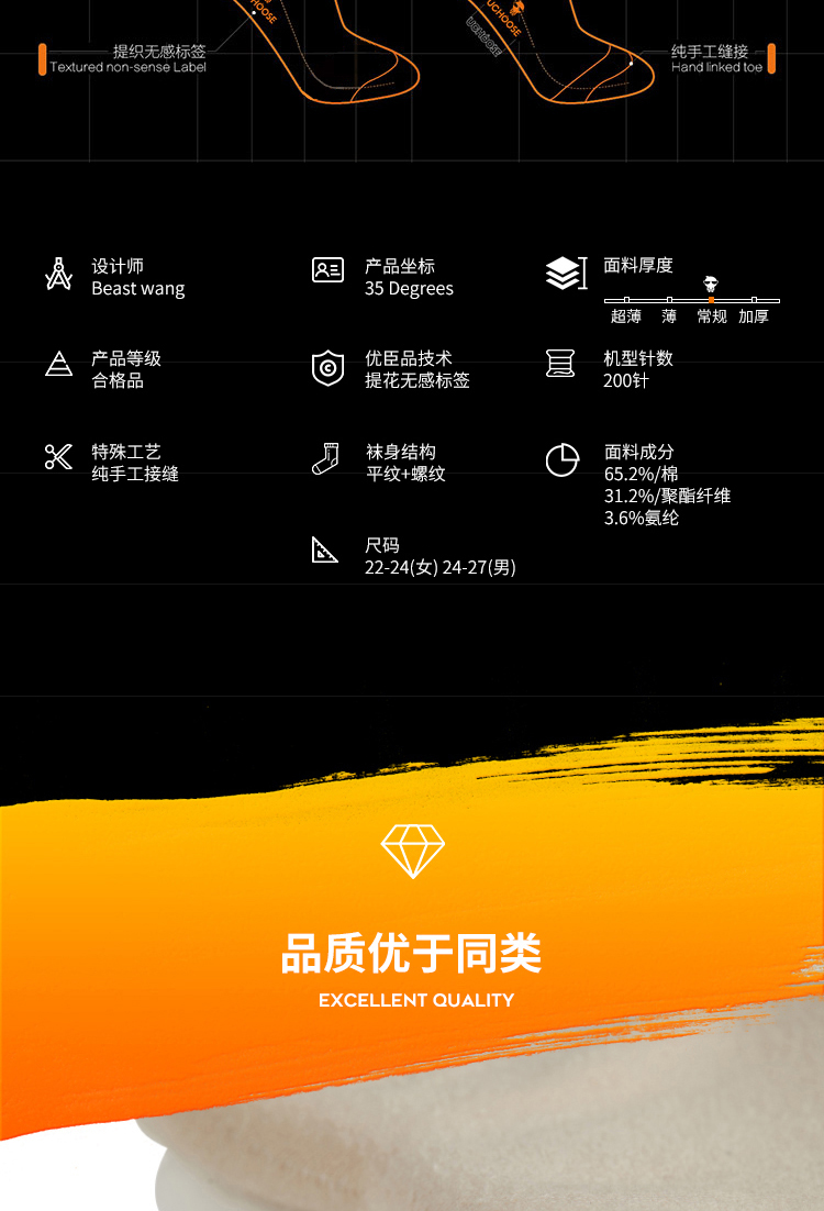 这款袜子面料以65.2%棉为主,混31.2%聚酯纤维,在添加了3.6%氨纶,经过过特殊处理,触感柔软亲肤,拒绝刺痒,抗菌环保健康,袜底无感提织LOGO,高端大气上档次,不影响穿着舒适度。有四大系列:抗菌止痒系列,VC润足系列,天然香薰系列,抑汗吸排系列。采用环保染色更安心~