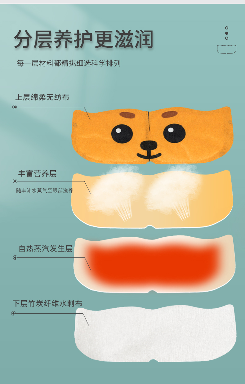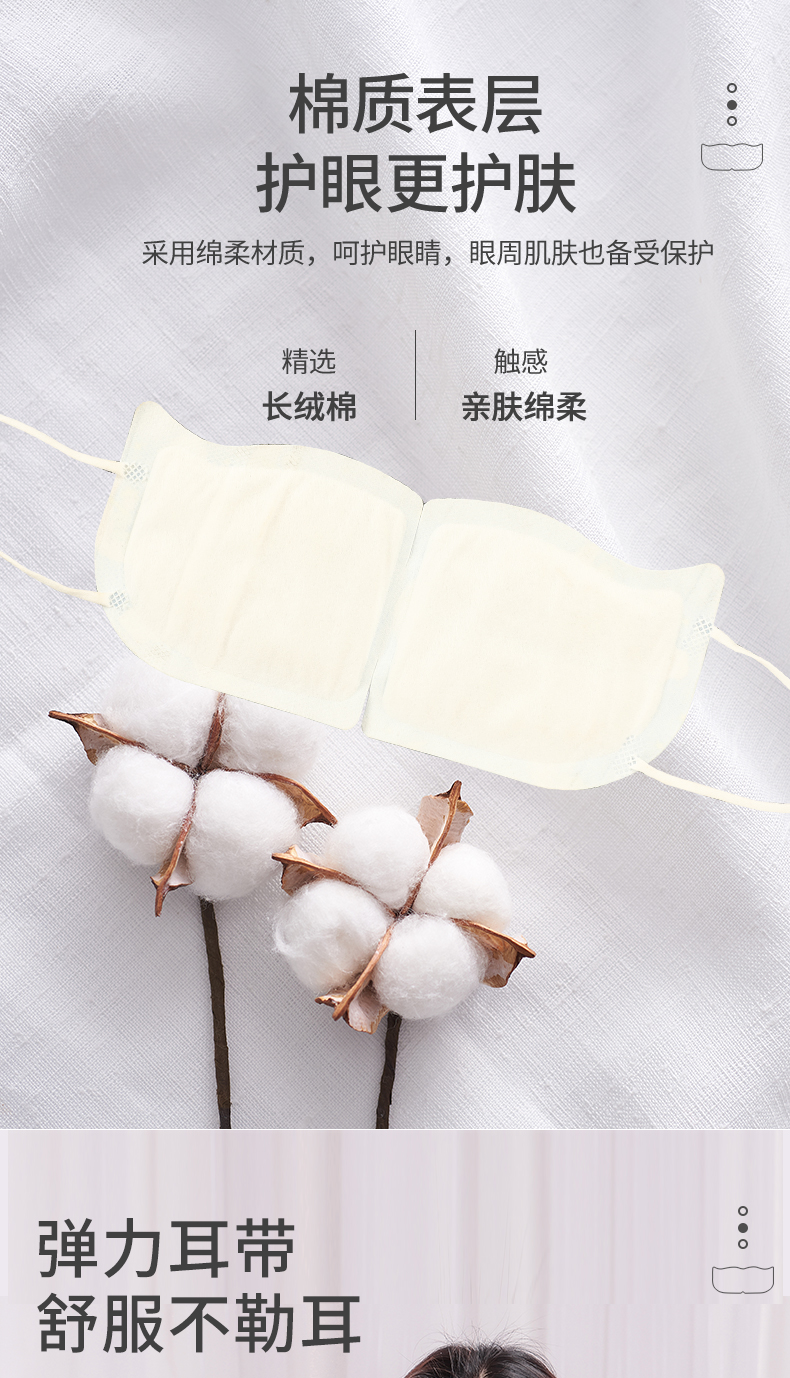 罩体是柔软高弹的水刺无纺布面料,亲肤安全无毒,内置1mm发热片,对眼部无压感,挂耳不疼,翻身不掉。