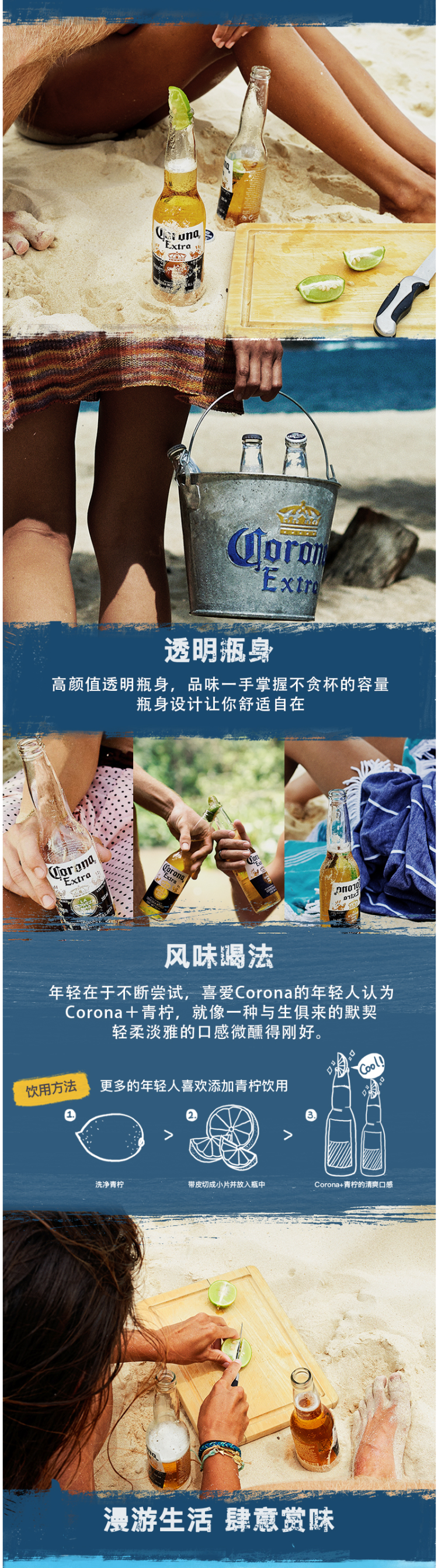 墨西哥人把柠檬随手放入科罗娜中,偶然发现柠檬的酸甜与清凉的科罗娜竟是绝配,此特殊喝法于是在美墨边境流传开来,并成为独一无二的「科罗娜加柠檬」,酸甜的柠檬与清凉的科罗娜啤酒堪称举世无双的绝妙搭配。