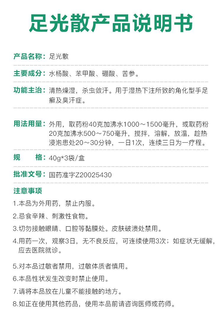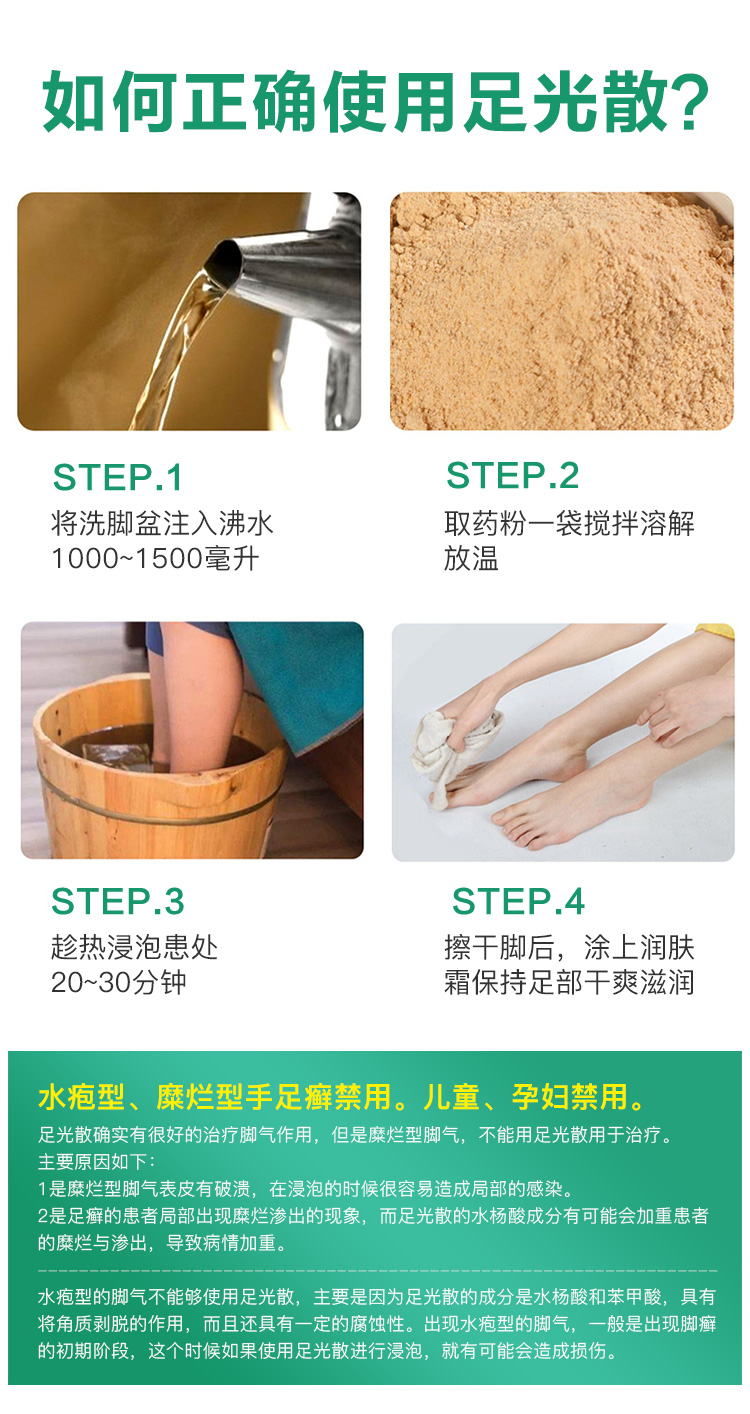 这款九芝堂足光散专治脚臭脚痒、足部脱皮、皮肤硬化以及角化型足癣,国药准字OTC标,使用时将其倒入沸水,带沸水放温后趁热浸泡,1日1次,1次20-30分钟。