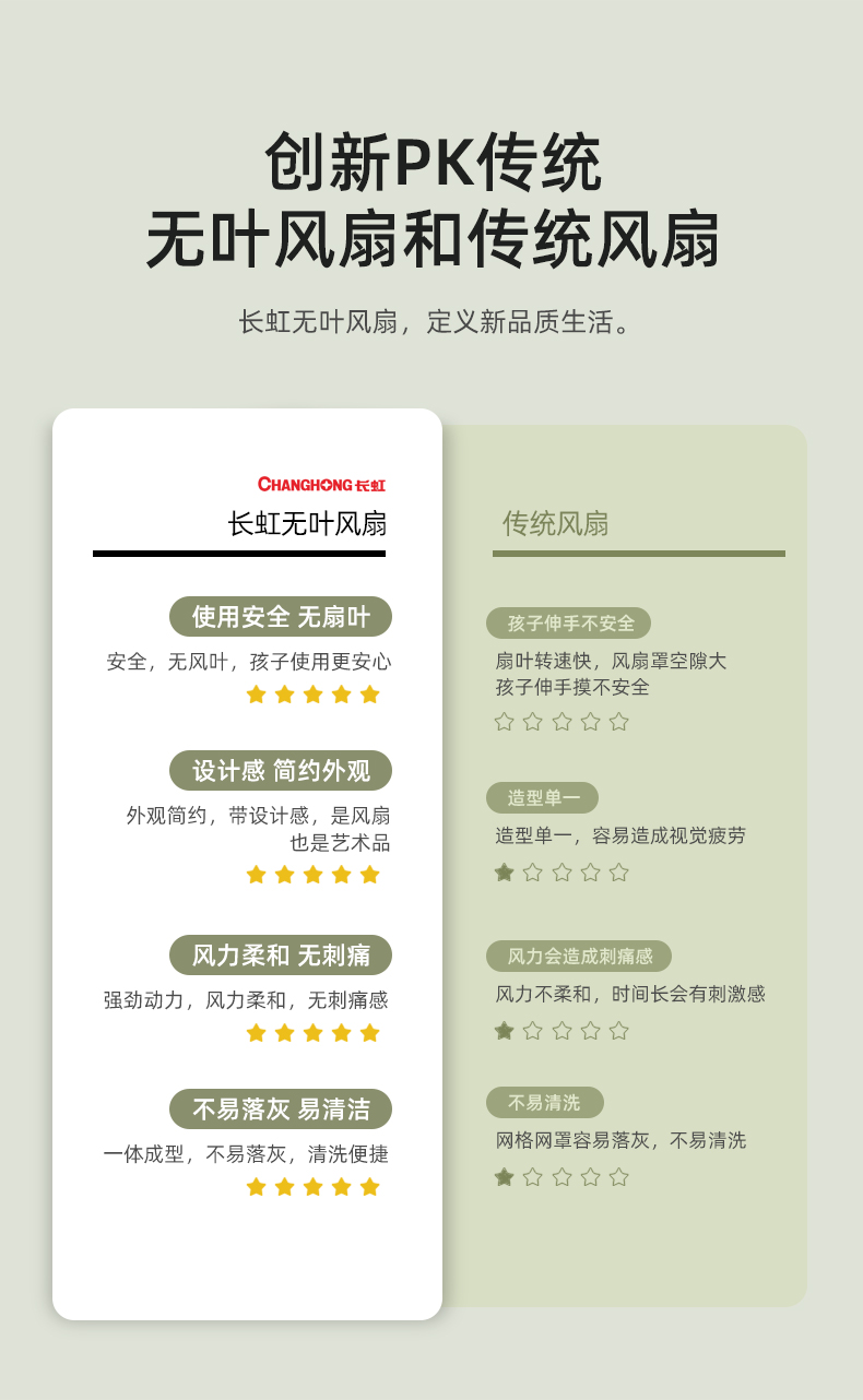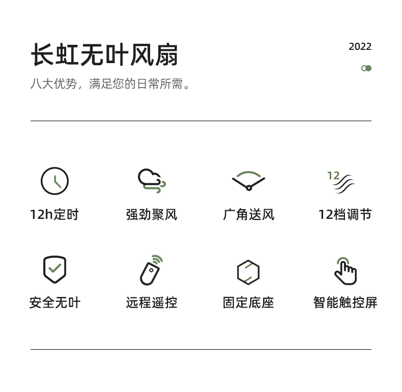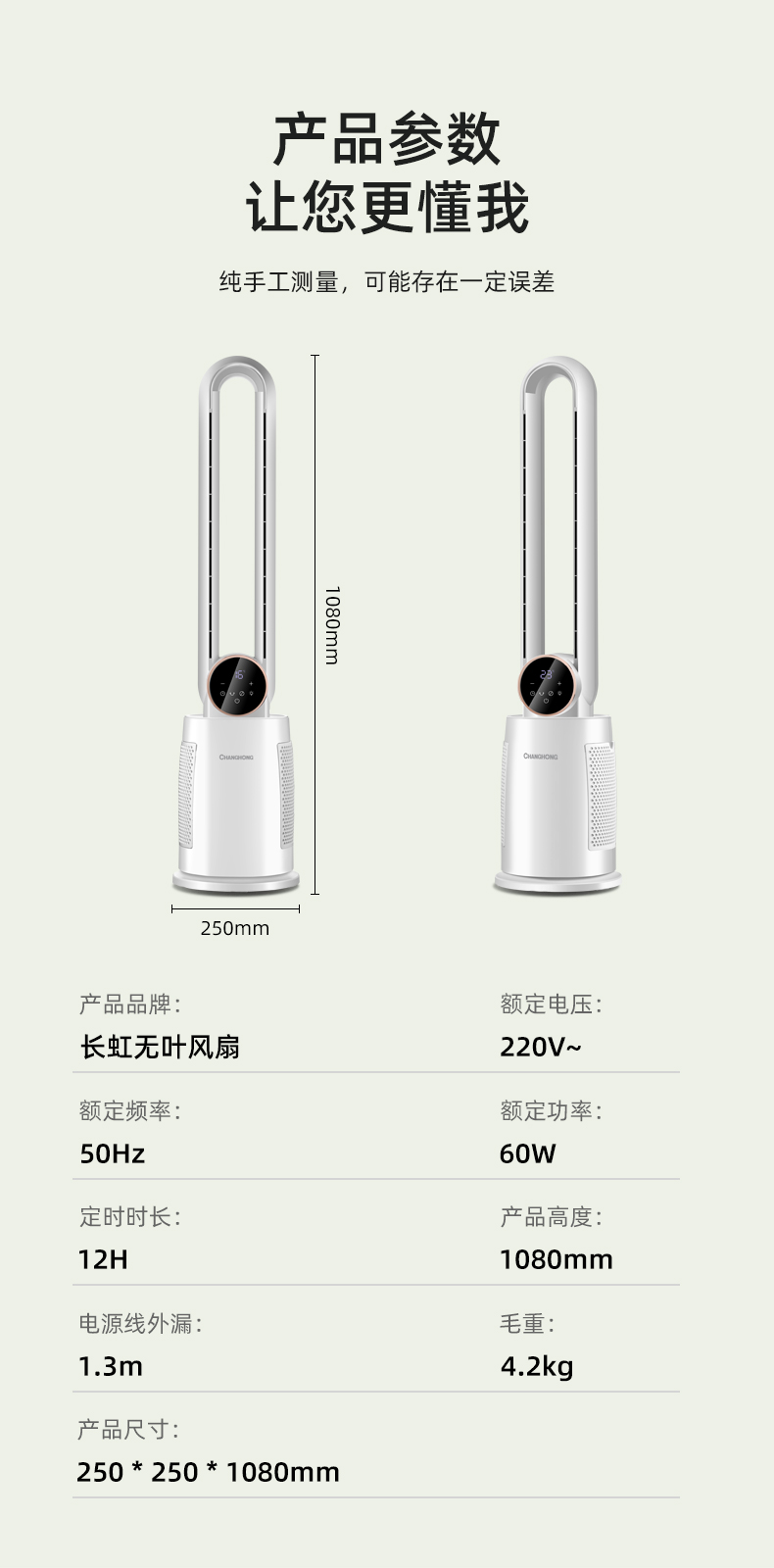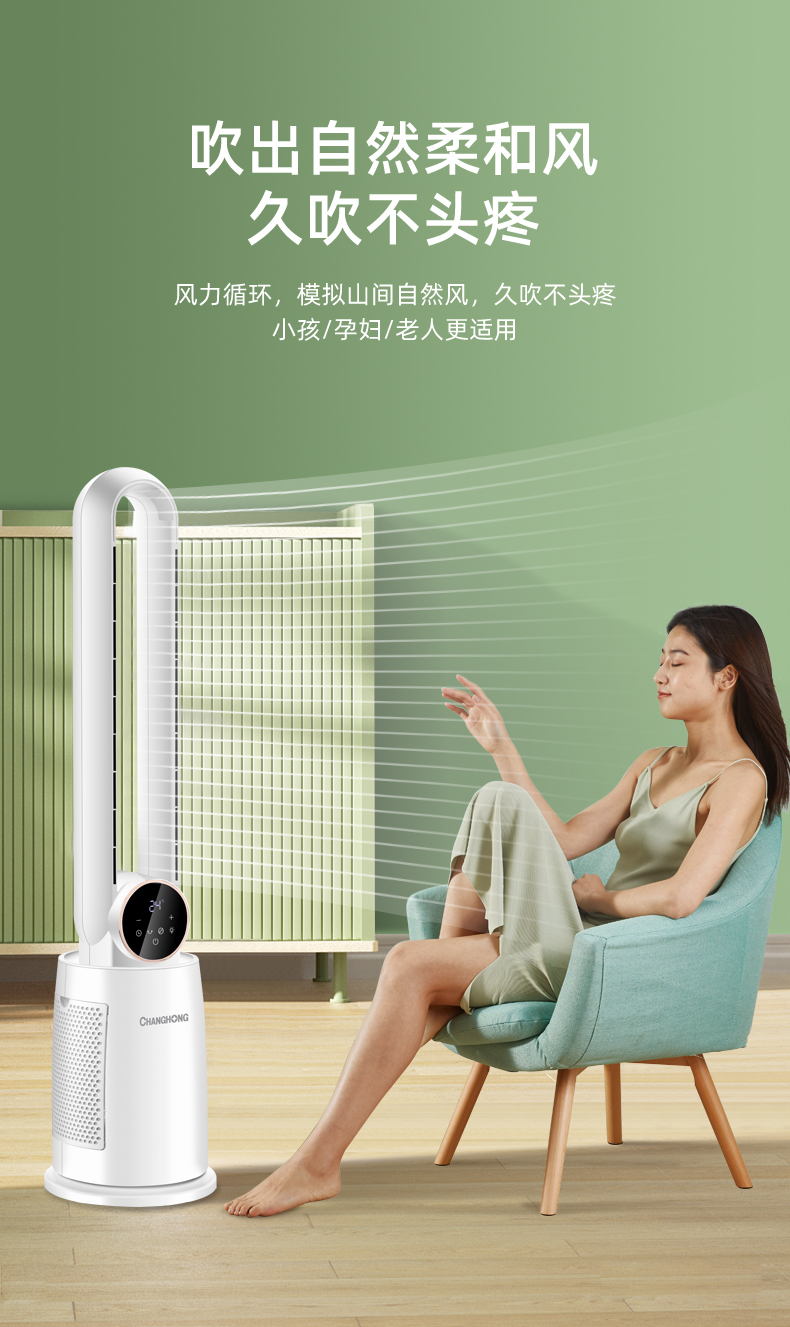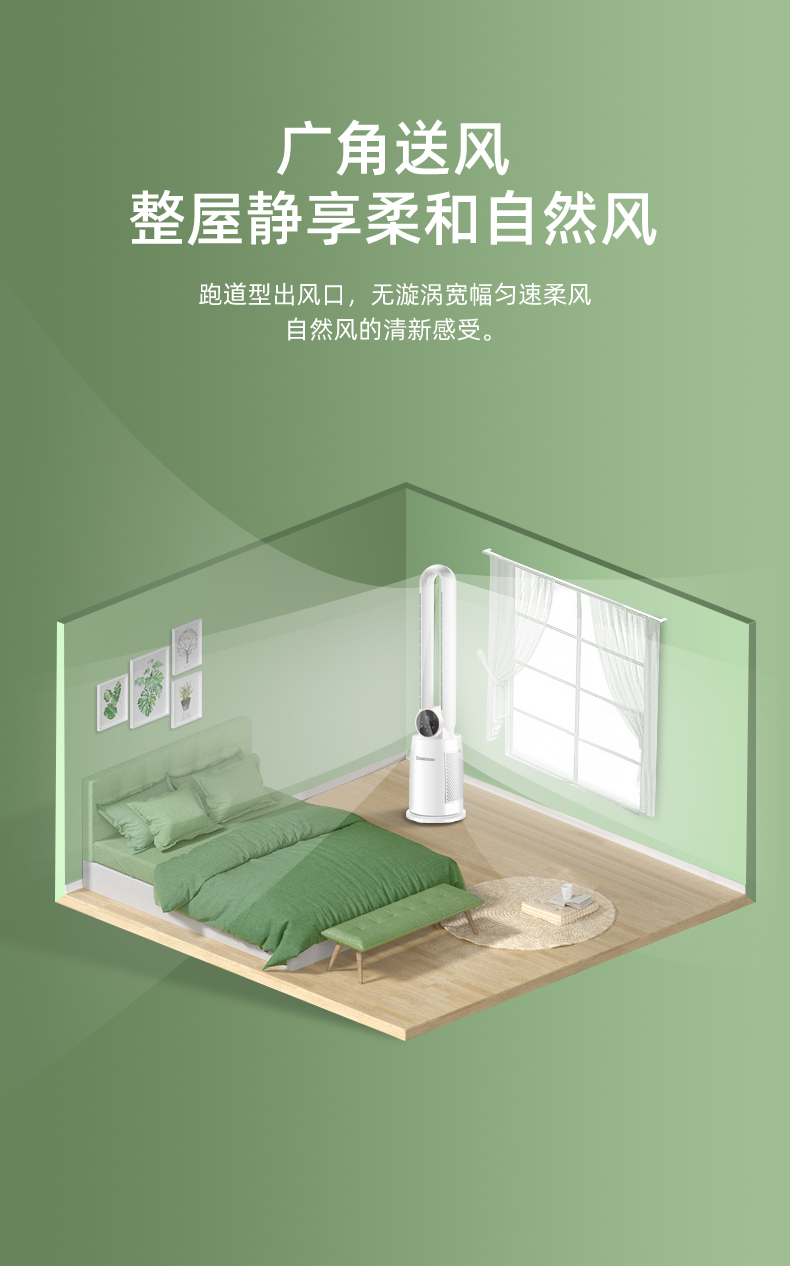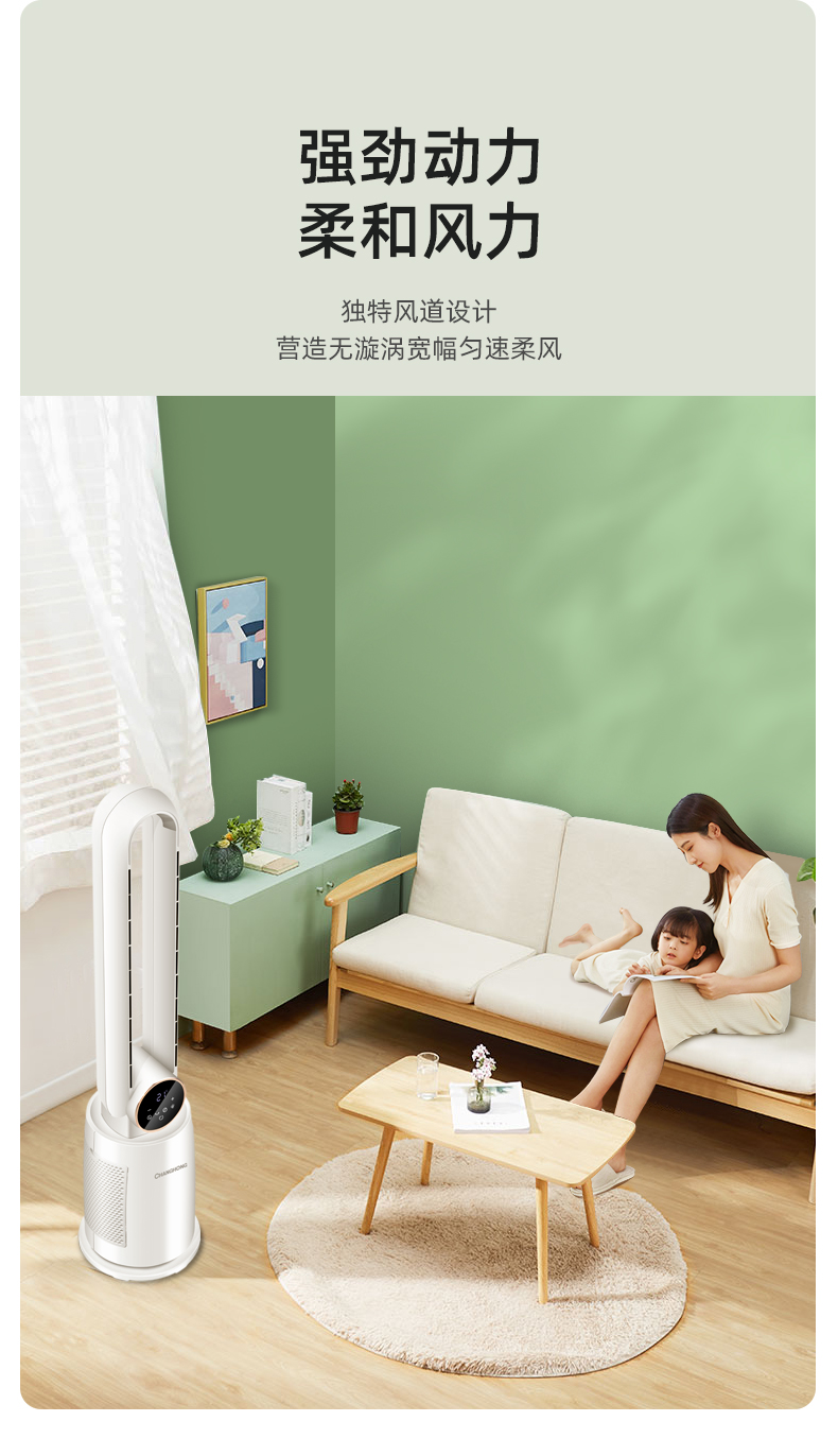 高端新品无叶风扇,大气高颜值,立式占地空间小,更省心。采用下潜式涡轮风轮,独特风道无叶设计,营造无漩涡宽幅匀速柔风。相比传统风扇没有扇叶,不易积灰,清理方便,没有被扇叶夹手的危险,是有孩子的家庭的首选。