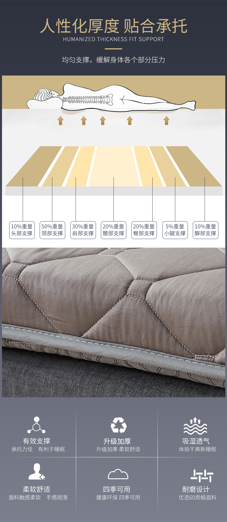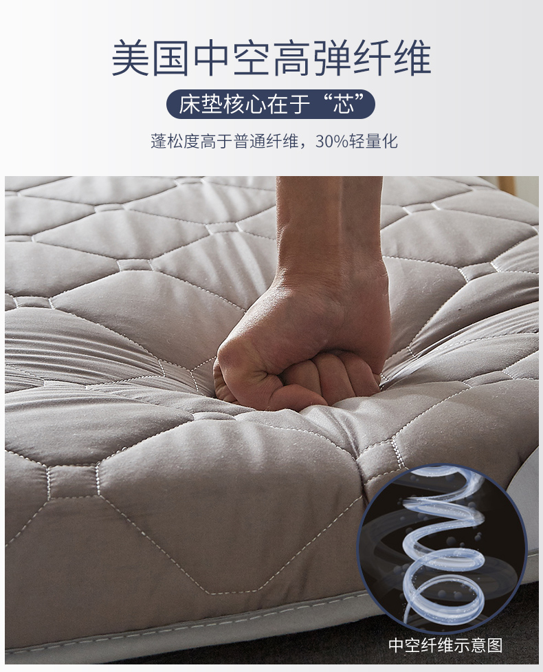 内充美国中空纤维,具有高度紧密的结构,蓬松度高于普通纤维,30%轻量化,软硬适中,不易塌陷。有效贴合人体曲线,均匀承托,合理缓解人体各个部位压力。有弹力绑带设计,不易滑动,可折叠易收纳,不占空间。