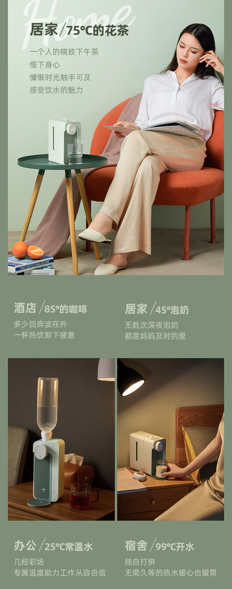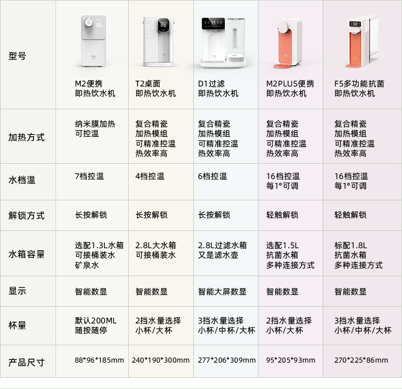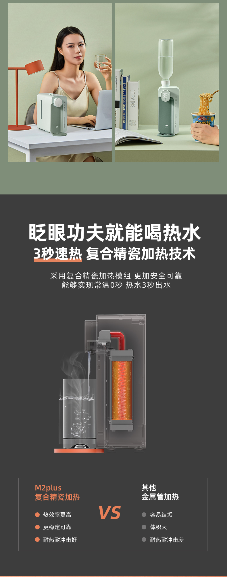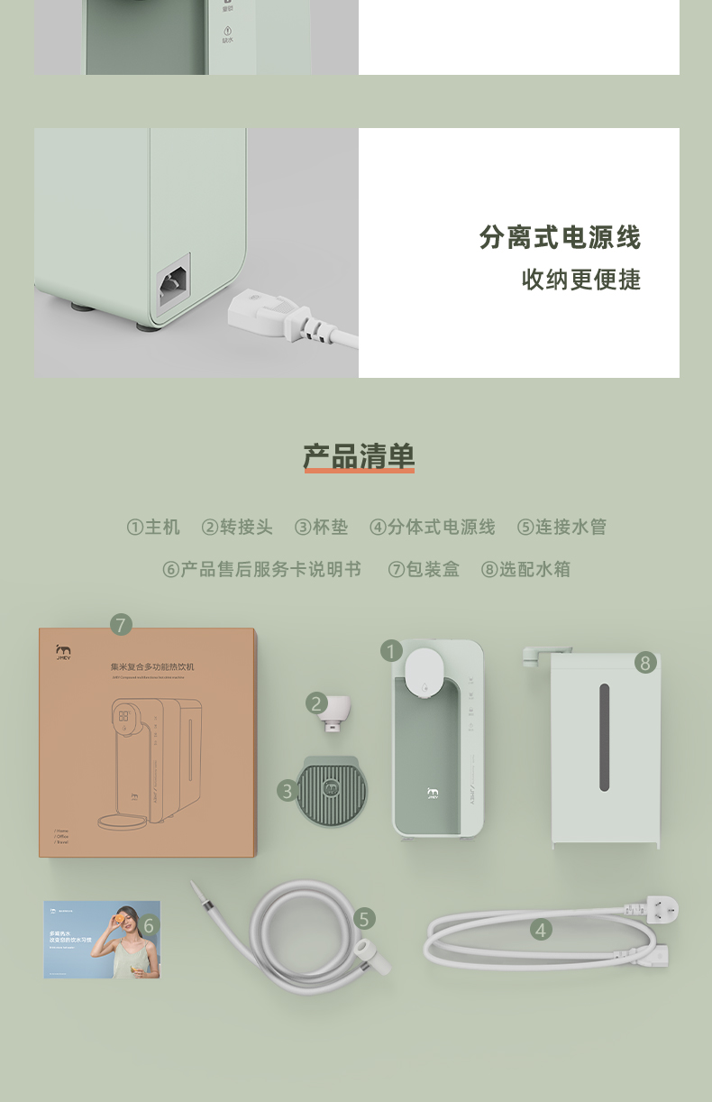 这款集米饮水机,升级复合精瓷加热技术,相比金属管热效率更高更稳定,3秒即热,现烧现喝新鲜热水。迷你机身,口袋大小,方便移动携带,满足厨房,卧室,浴室、办公室不同场景需求,外出旅行携带也很方便。