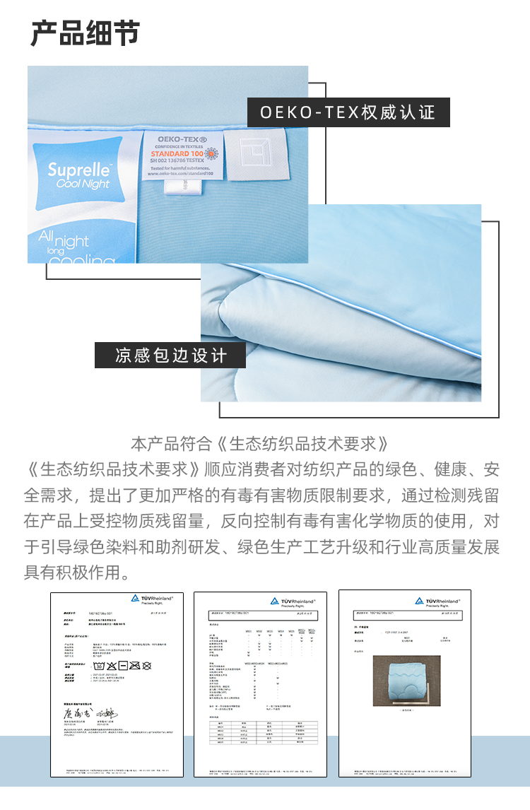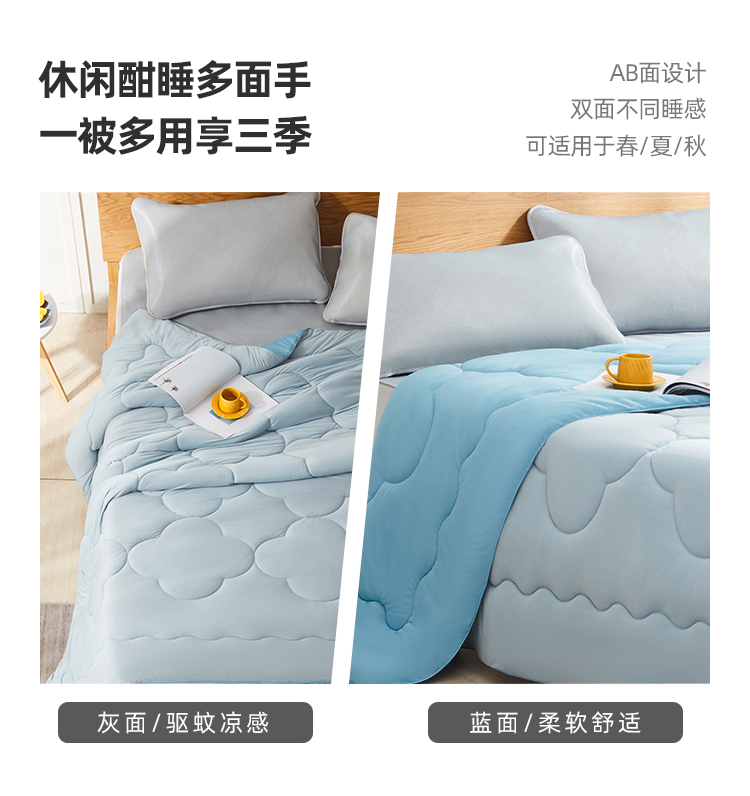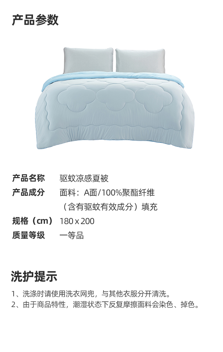 双A纺织物通过JTC专业性标准检测,无荧光、无异味、不掉色。AB双面设计,灰面驱蚊凉感、蓝面柔软舒适,精美包边经久耐用,可水易打理。
