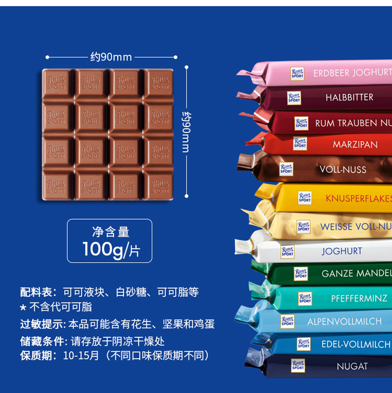 Ritter Sport在全球20大巧克力制造商中名列第四位。作为排块巧克力的创作者,Ritter Sport每种口味的巧克力都是用8种不同的可可混合而成,这款巧克力,口感丝滑浓郁香甜可口,甜而不燥,每一口都是满满的幸福。