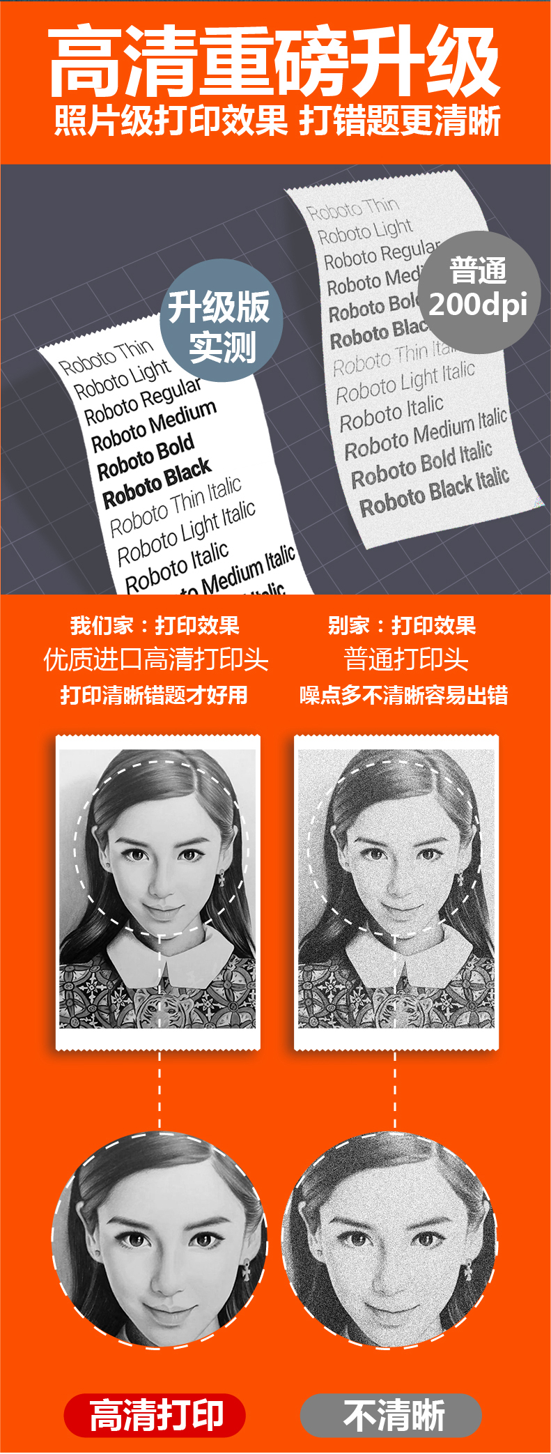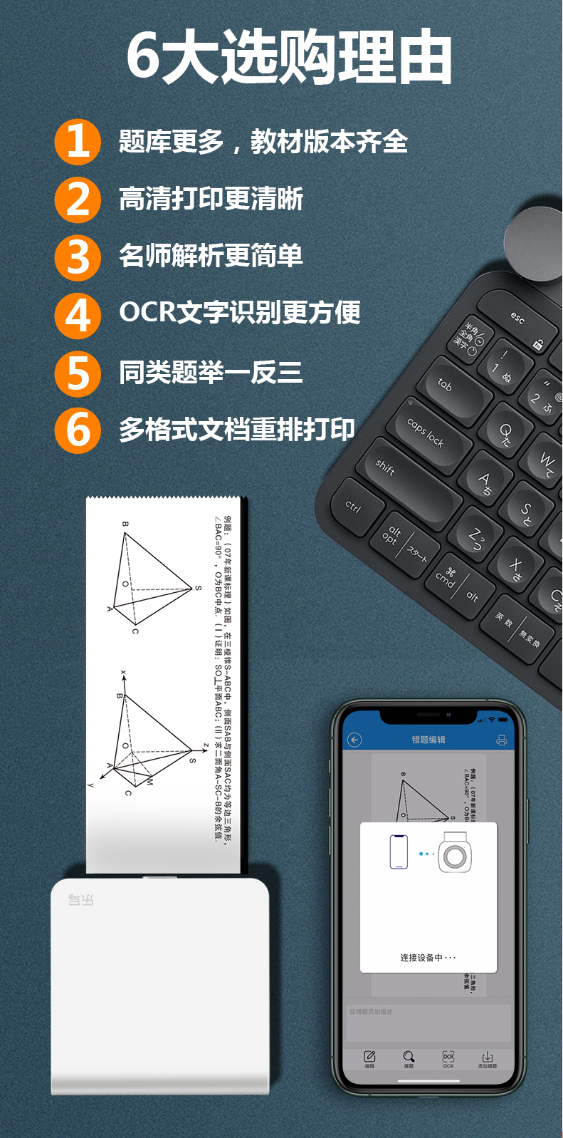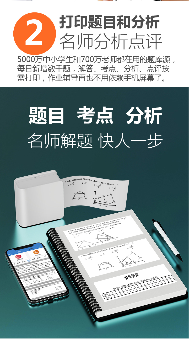 学生错题打印机,小巧便携,蓝牙直连,无需添加油墨,环保健康,省钱省心,内800mAh锂电池,续航持久;海量题库,涵盖小学到高中所有科目、大学主要科目,遇到难题随手一拍,秒出答案;把错题打印出来粘贴在错题本上,不用手抄,方便复习。