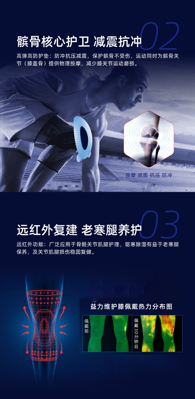 这款益力维 石墨烯远红外护膝 ,拥有四项专利认证,高端定制,选用新型石墨烯纳米材料,高密度三维编织技术,选用石墨烯70D超细长丝双编,柔软舒适,高强度高弹力,整体受力均匀,不分层,增强关节屈伸稳定性及韧带肌腱保护,护膝纱线中富含负离子远红外,可以促进循环,排酸减疲,驱寒除湿等,养护关节;