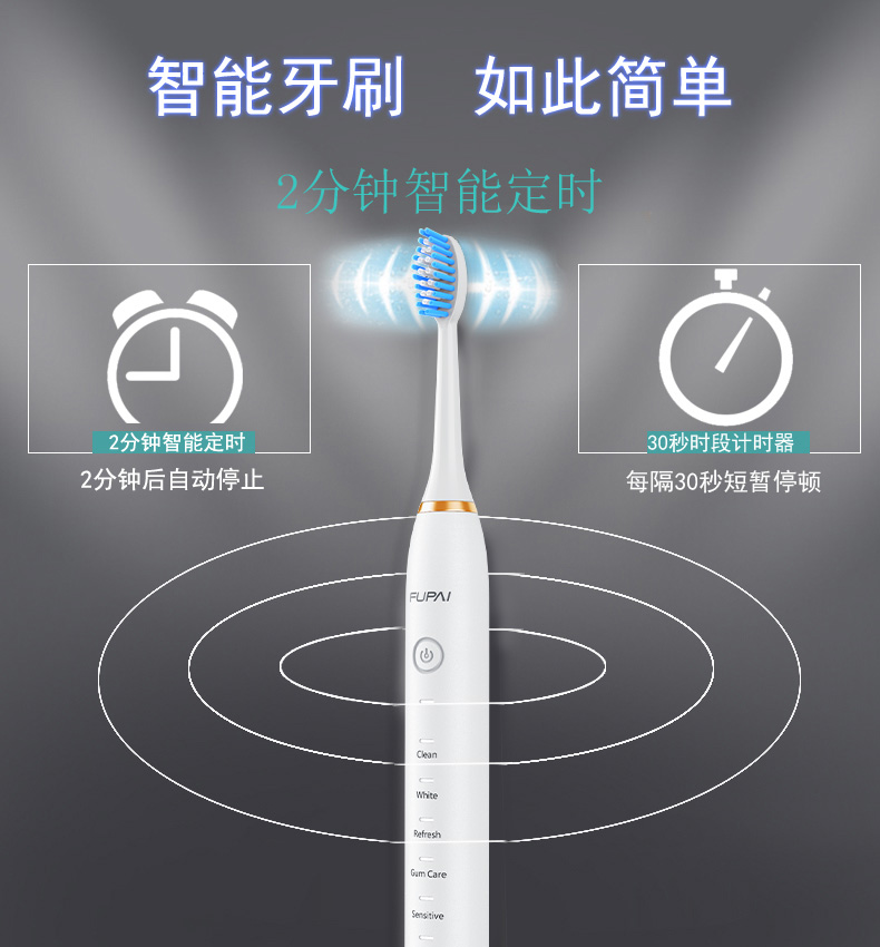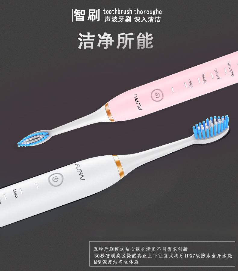 这款福派 A6 plus 充电式 成人声波电动牙刷,是升级款,高频声波技术,所产生的微气泡,冲刷牙缝口腔死角;五档刷牙模式,自上而下,清洁模式,美白模式,抛光模式,牙龈护理模式,敏感模式,低频、中频、高频,三种频率表,共15种档位,可以根据各人不同的口腔环境,进行选择。