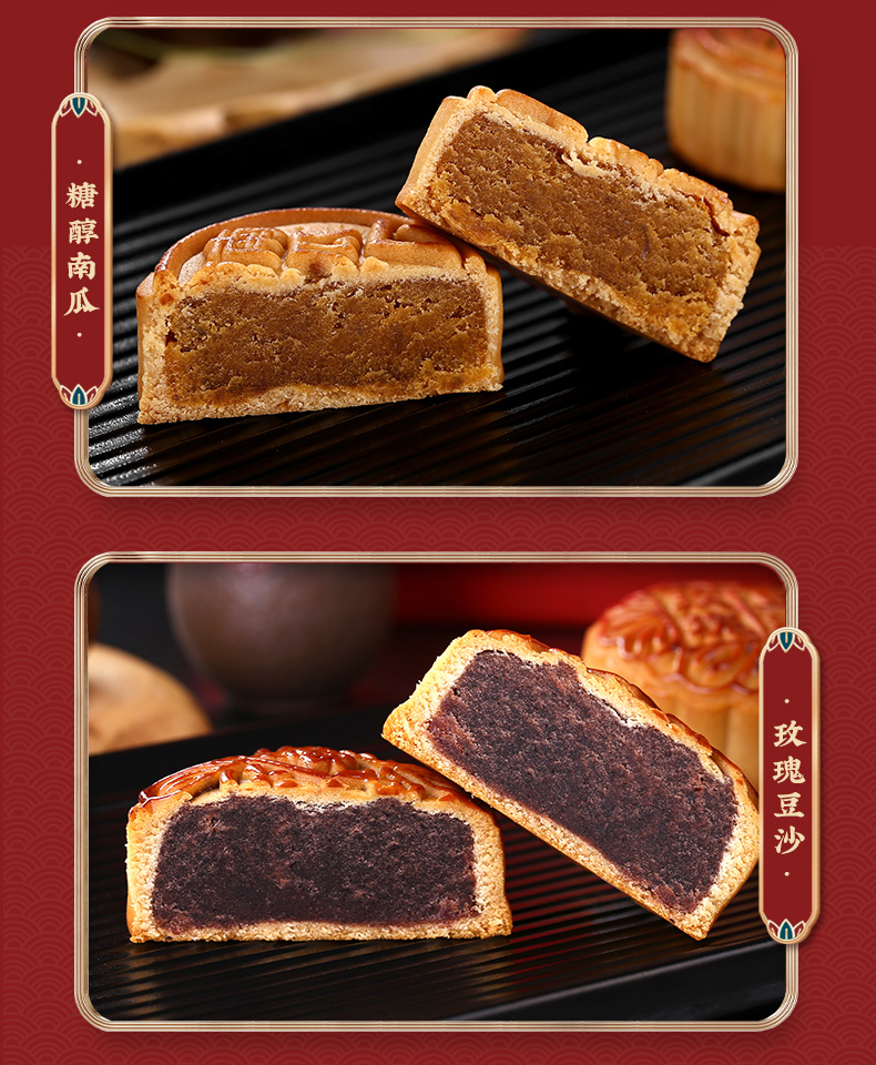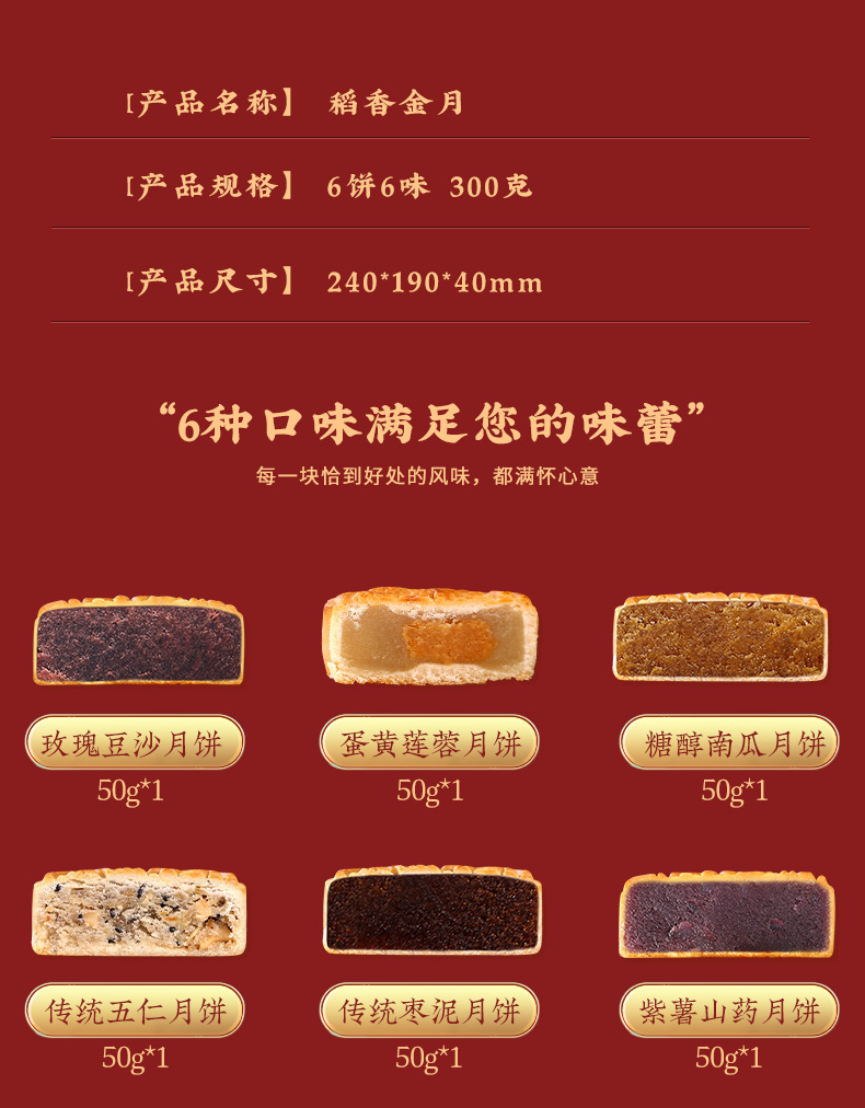 6饼6味,包含:蛋黄莲蓉、玫瑰豆沙、糖醇南瓜、传统五仁、传统枣泥、紫薯山药。