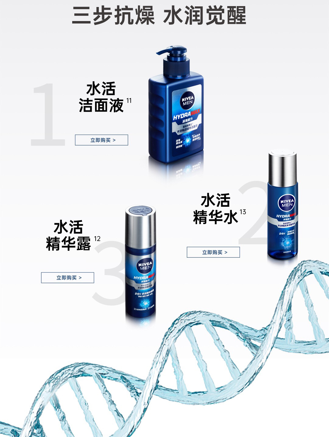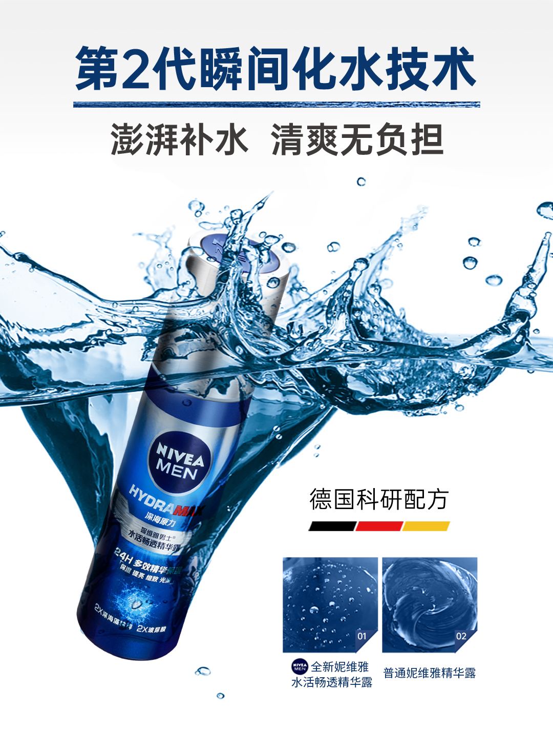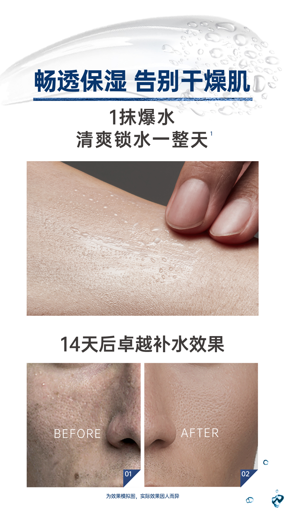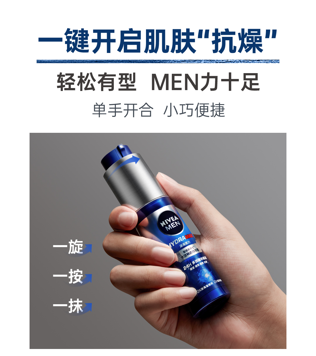 妮维雅小蓝管,专为男性肌肤设计,一抹化水,清爽保湿,深入肌底,补水保湿,为肌肤带来舒爽体验。无酒精配方,清透露状质地,深入肌底,快速吸收,肌肤畅透不感粘腻,瞬间注入大量水分,密集保湿,提供长时间持久滋润。