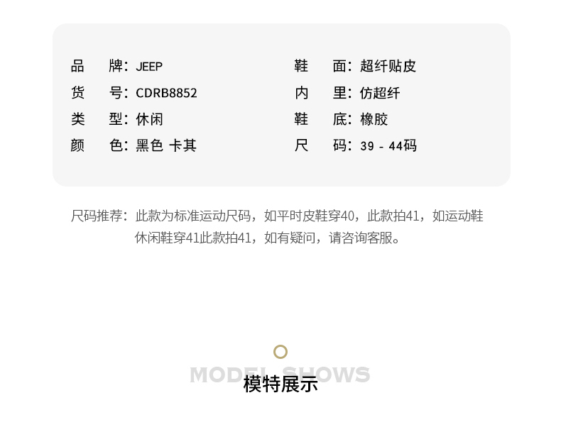 尺码建议:这双鞋为标准运动尺码,如平时皮鞋穿40,此款拍41,如运动鞋休闲鞋穿41此款拍41,如有疑问,请咨询客服。
