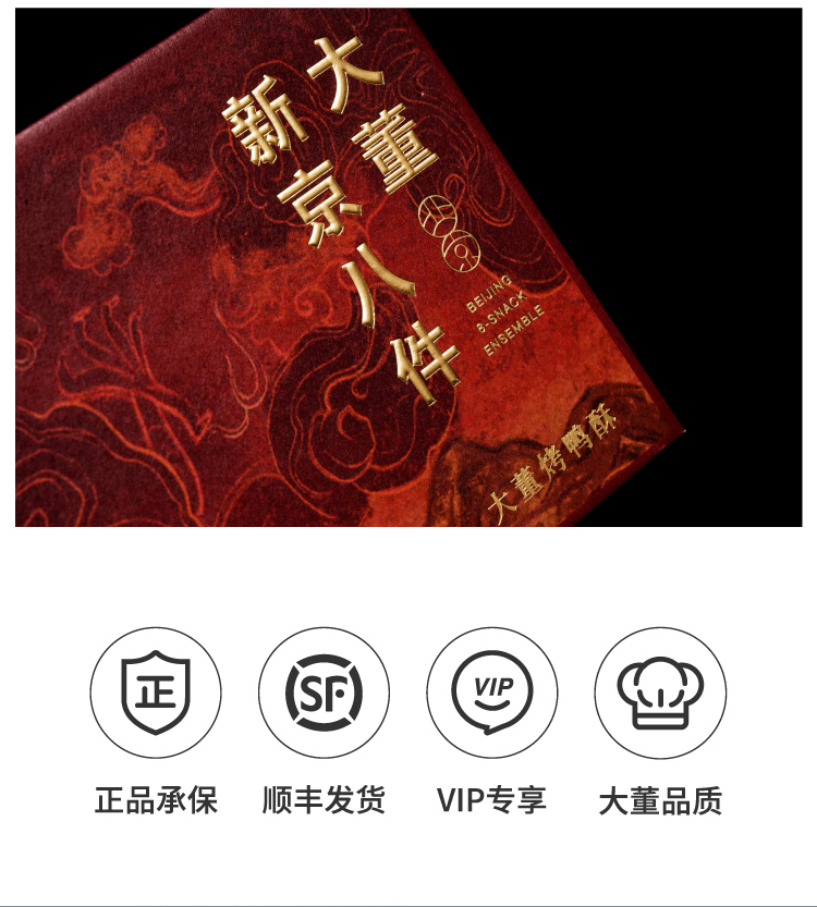 天猫董到家旗舰店119元,可领80元优惠券,实付39元到手,什锦装此价,高档礼盒包装。包含芝士培根牛舌饼、黑芝麻驴打滚、大董烤鸭酥、蜂蜜枣花酥、海藻糖豌豆黄、橙香山楂小菓、抹茶绿豆桂花糕、一朵玫瑰酥,共8种精致小点心,创新的京八件礼盒,不管是送人还是自食都是不错的选择。