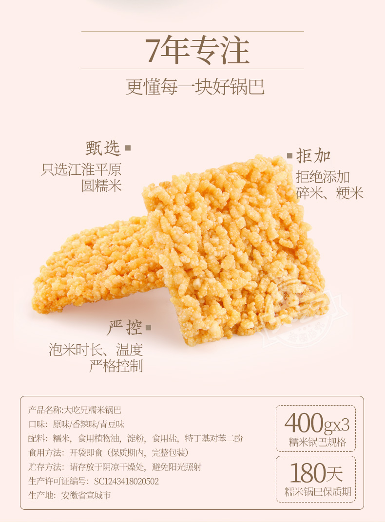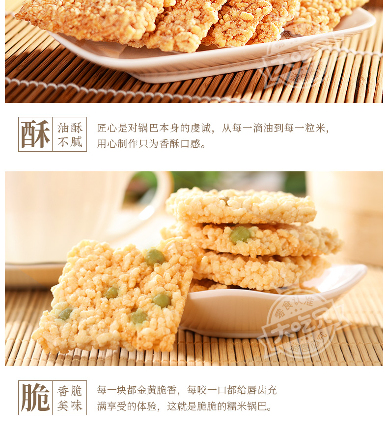 天猫粮悦食品旗舰店39.9元,下单立减10元,可领3元优惠券,实付26.9元到手,有原味和香辣味可选。这款悦 手工大吃兄小糯米锅巴,选用来自江淮平原的糯米煎炸,颗颗精选,不添加 碎米、粳米纯糯米、不粘不硬,色泽金黄,香脆可口,满嘴酥香,规格是400g*3盒 独立内袋。