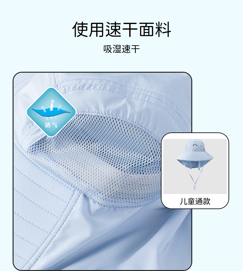 这款Toread kids 探路者 儿童款速干大帽檐防晒帽 , 使用速干面料,吸湿速干。前侧帽檐加大,防止阳光直射眼睛,后侧加长,护颈防晒。侧面拼接网纱,清爽透气帽后可调节尺寸 ,佩戴松紧适宜。