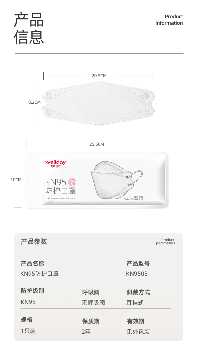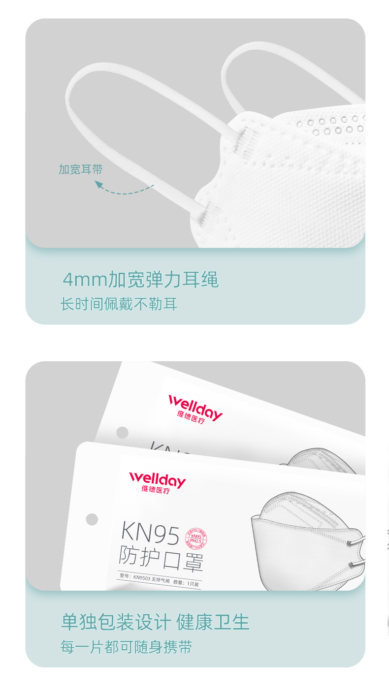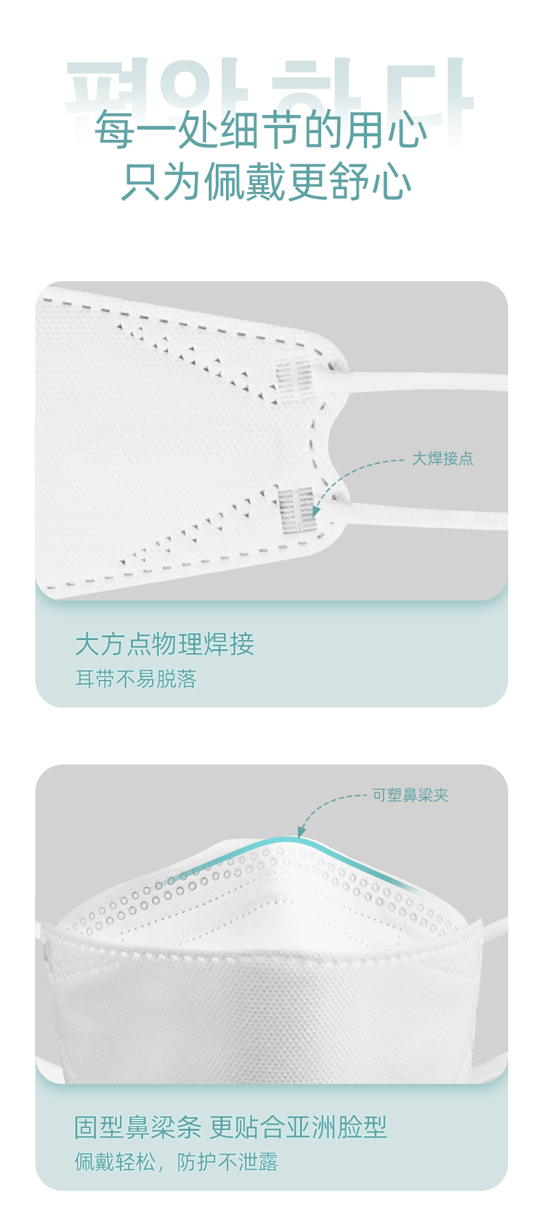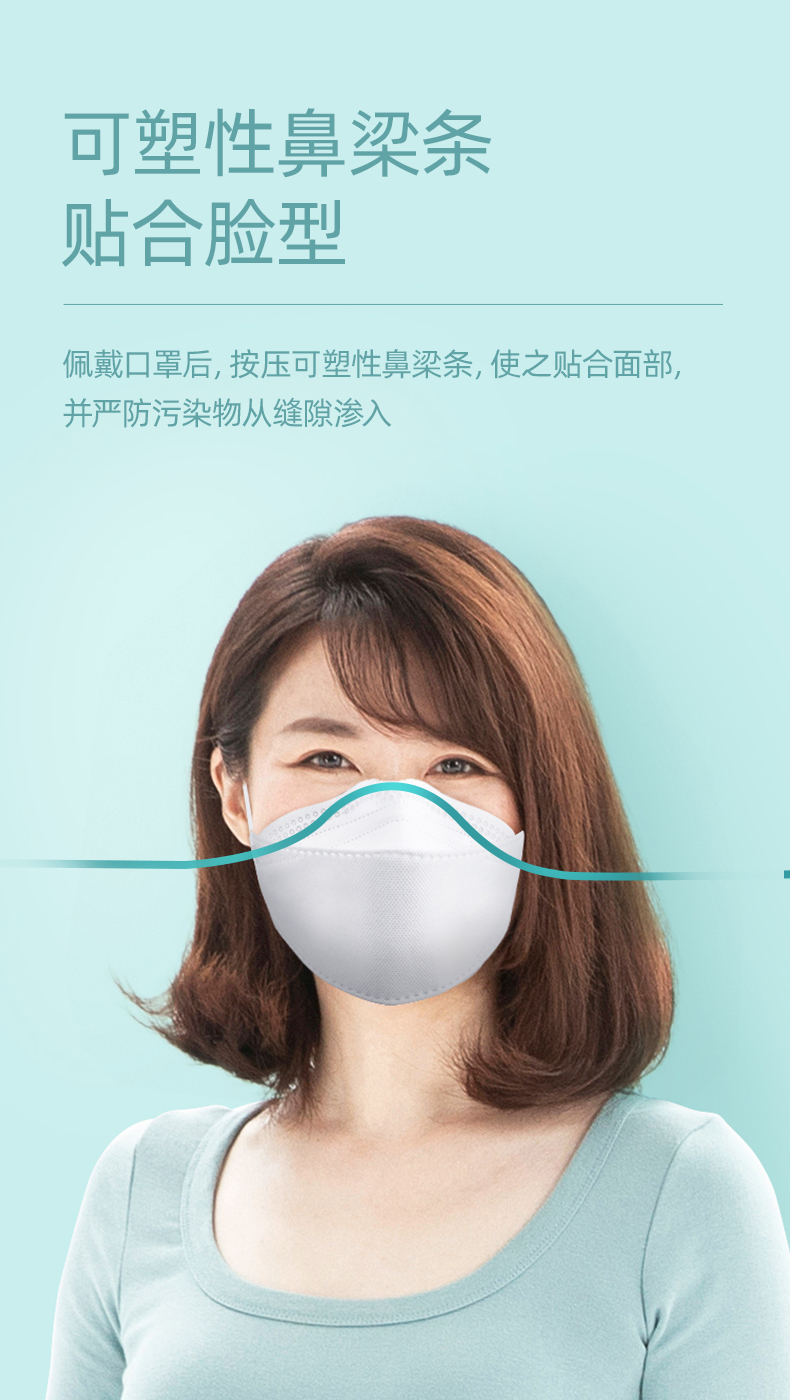 双层熔喷四层防护,单只独立包装,有效避免二次污染。鱼型4D立体结构设计,可塑性鼻梁条贴合脸型,口鼻处形成更大的呼吸空间,不粘嘴巴佩戴不闷,呼吸更顺畅,无缝贴合面部,隔绝污染源,佩戴也更为舒适。