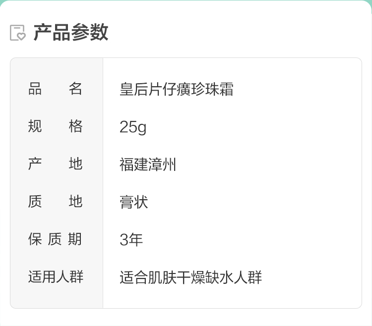 这款皇后牌 片仔癀珍珠霜,选用驰名中外的漳州特产片仔癀及闽南上等珍珠,另外还有田七、牛黄、麝香、蛇胆等珍贵原材料,深入肌肤底部,从细胞进行修护,促进皮肤新陈代谢,增强皮肤细胞弹性,滋养、保湿、柔润皮肤,解决面部青春痘、暗沉、毛孔粗大等问题,并能减少高温、低温、风砂等恶劣环境对皮肤的伤害,令肌肤白皙红润,娇嫩可人。