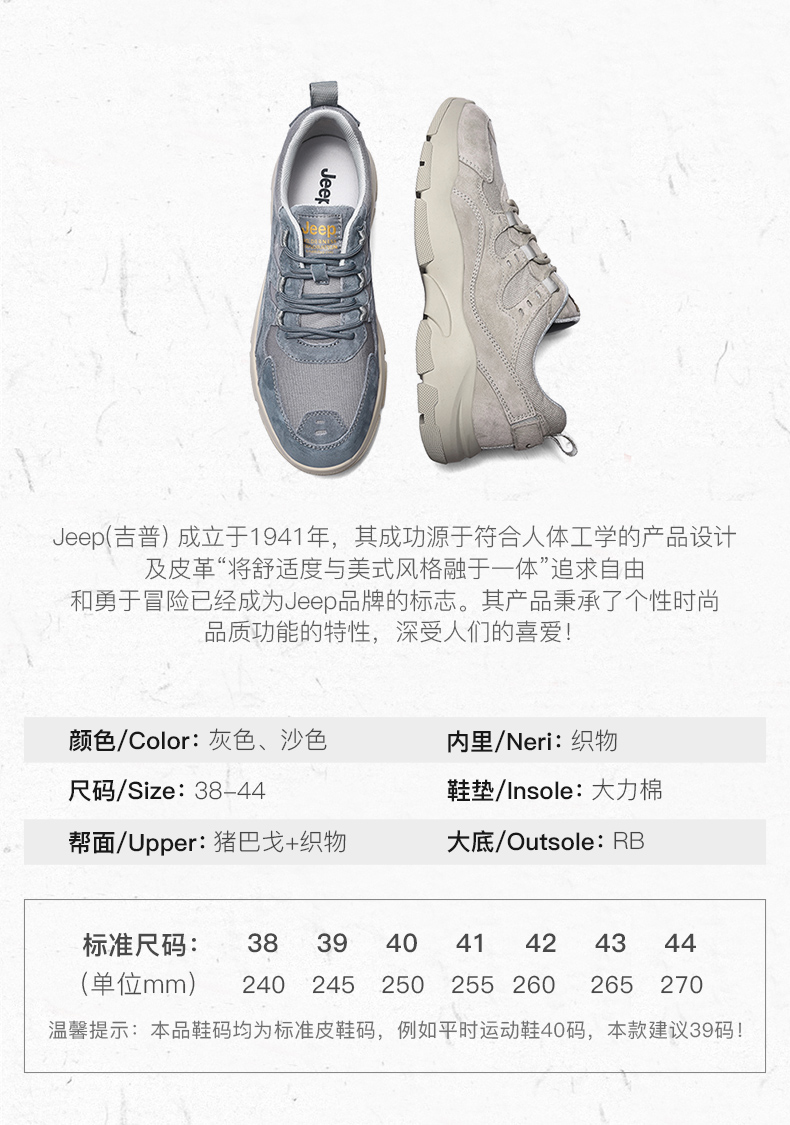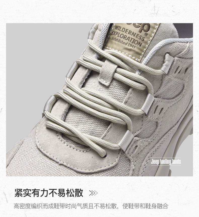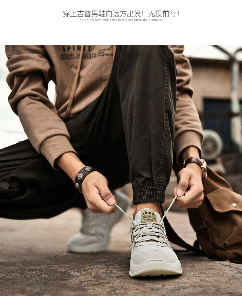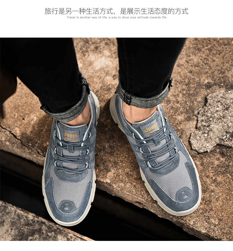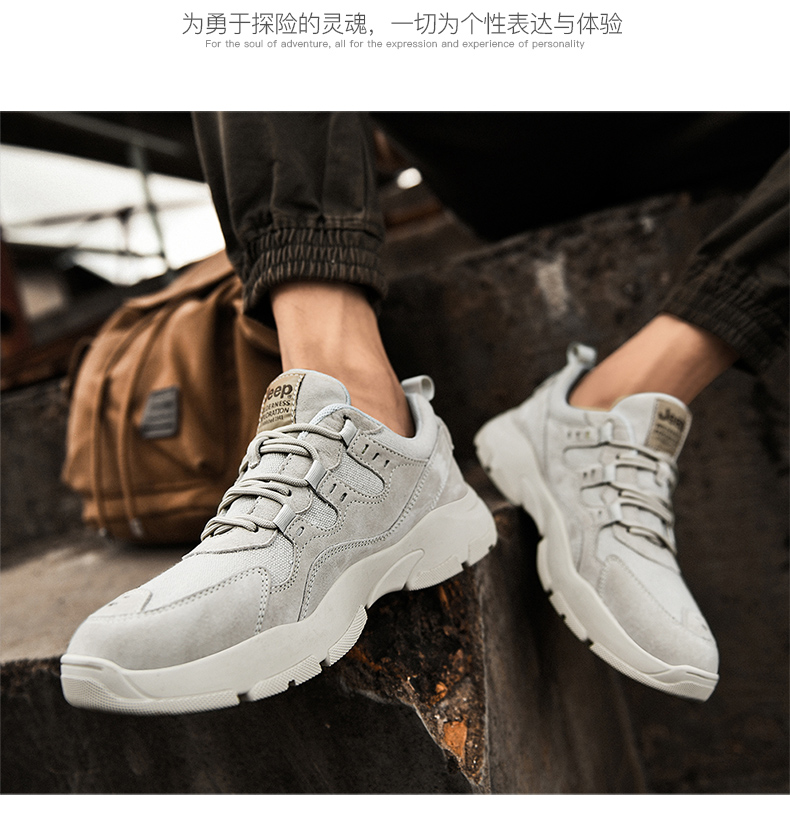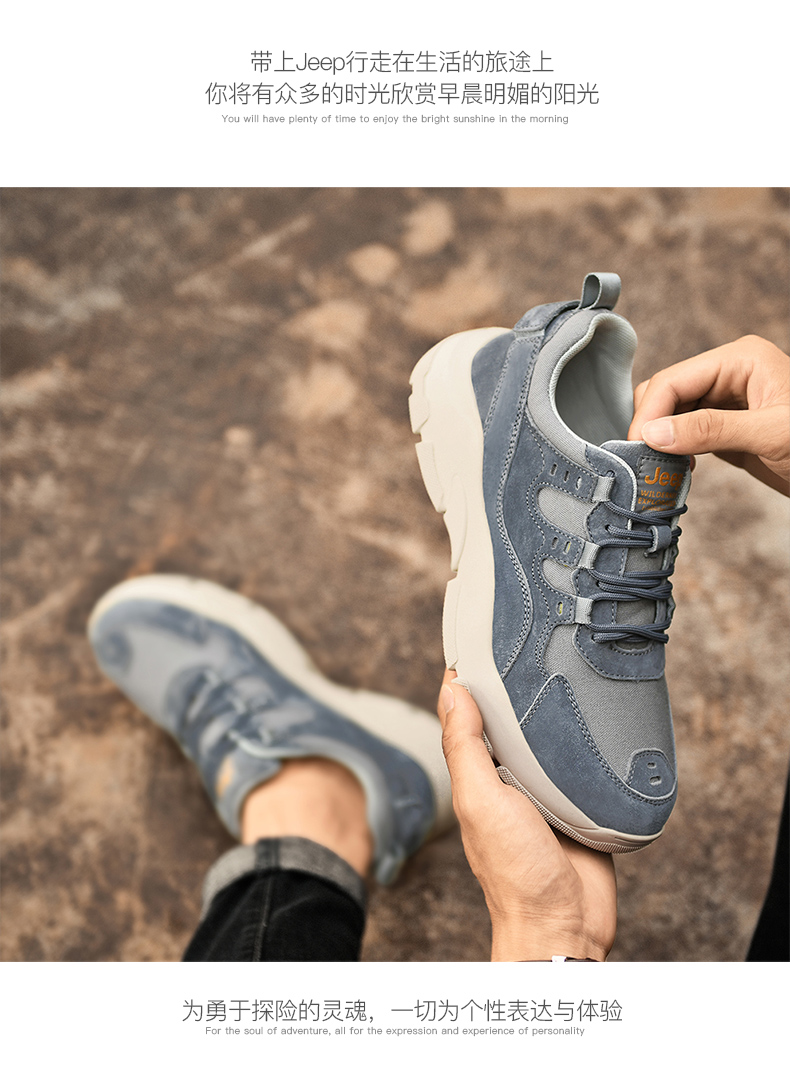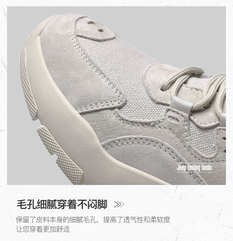 这款Jeep 男休闲户外软底运动鞋,鞋面是用头层猪皮+织物制成,保留了皮料本身的细腻毛孔,提高了透气性和柔软到度,摸着的手感也好。
