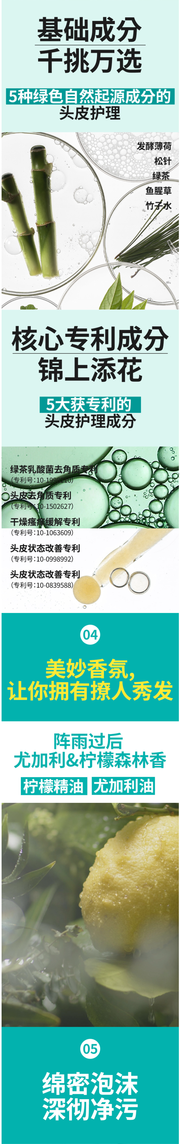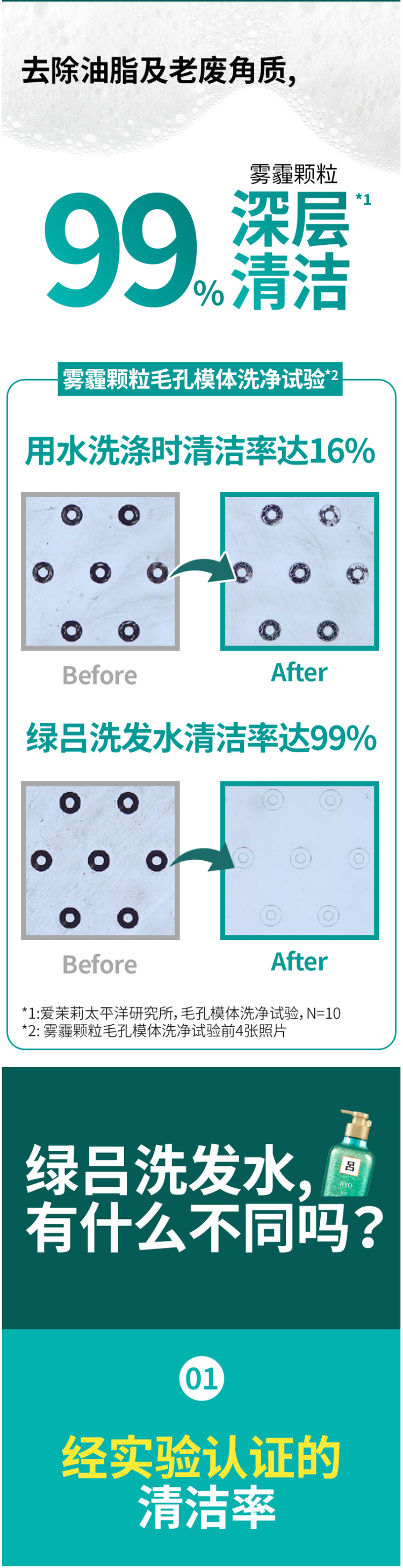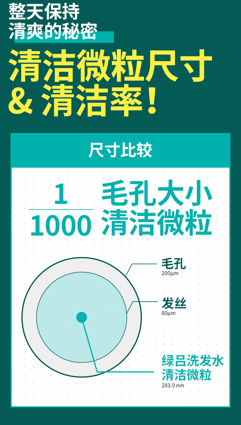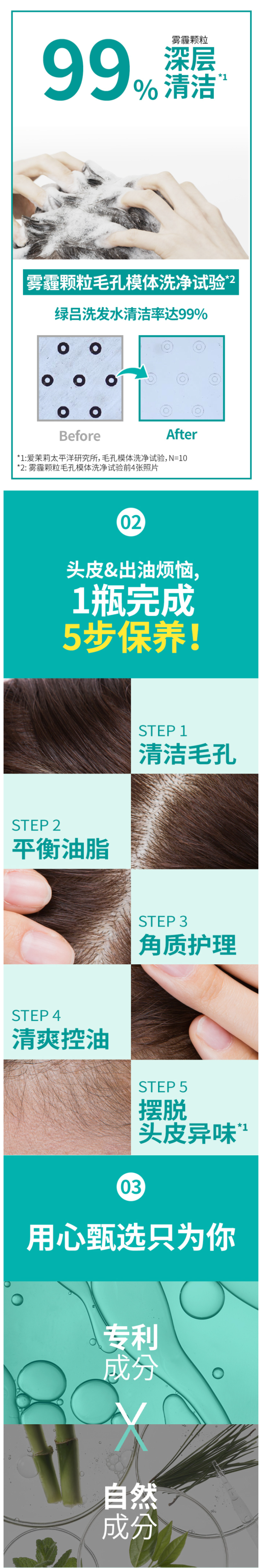 绿吕含有海藻、松叶、发酵薄荷等自然植物萃取成分,可有效清洁过多油脂及老废角质,令头皮达到水油平衡的状态。特别添加由绿茶水、莲花成分制成的绿色按摩微粒,可达到温和按摩的功效,提供更加洁净舒爽的使用感受。