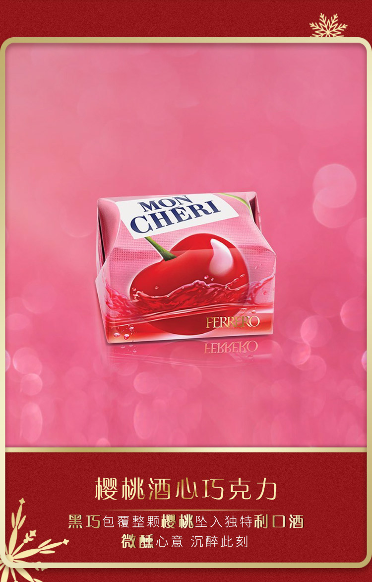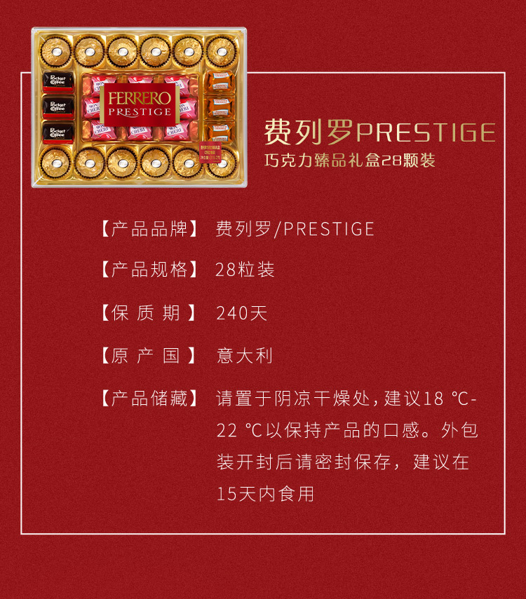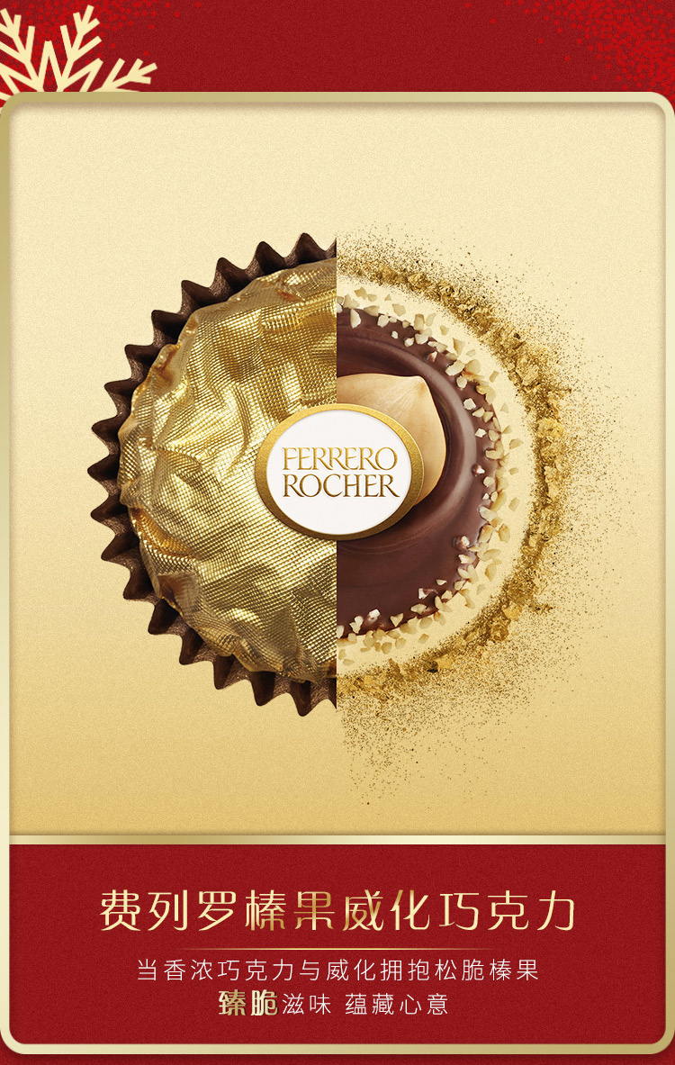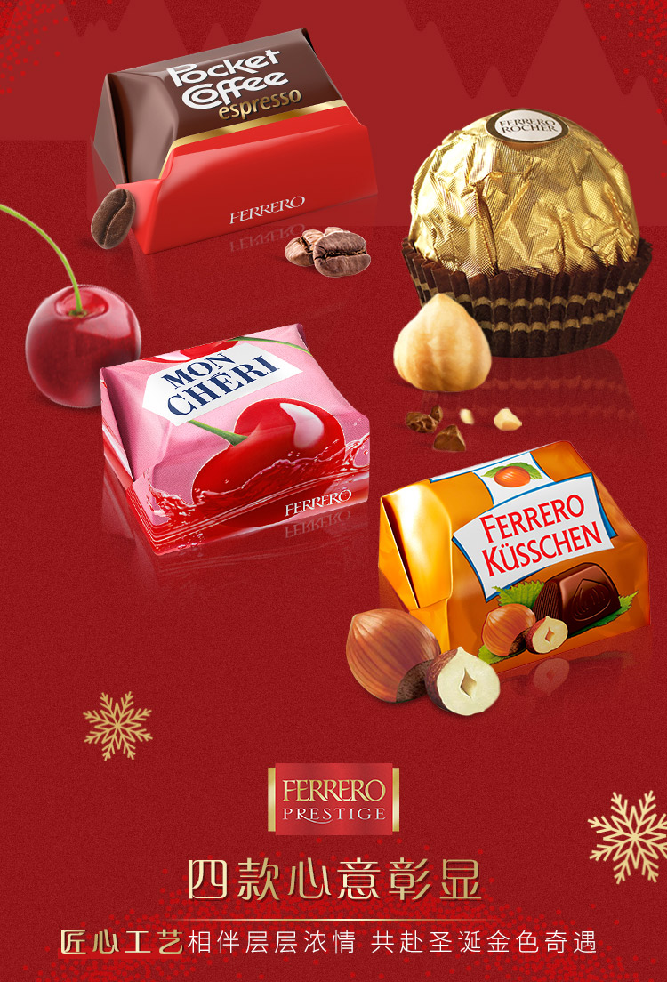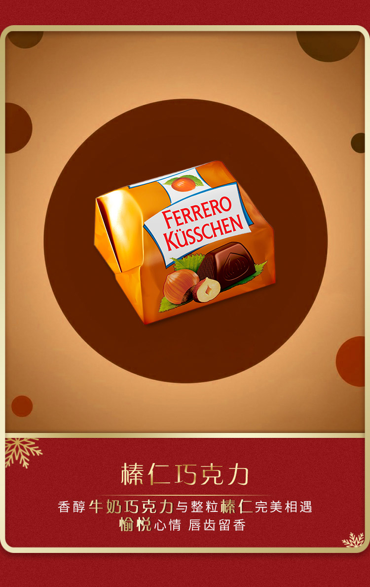 这款礼盒是费力罗榛果威化巧克力、樱桃酒心巧克力、咖啡夹心巧克力、榛仁巧克力的组合。