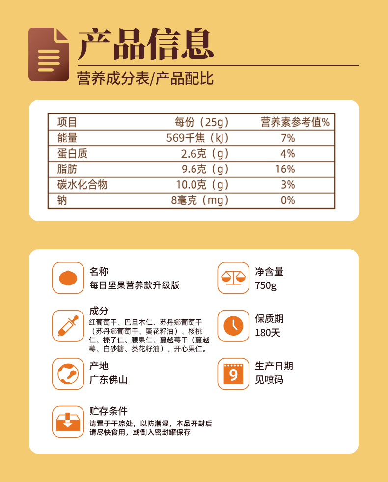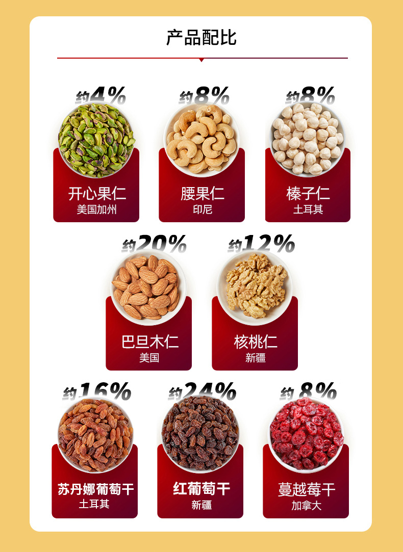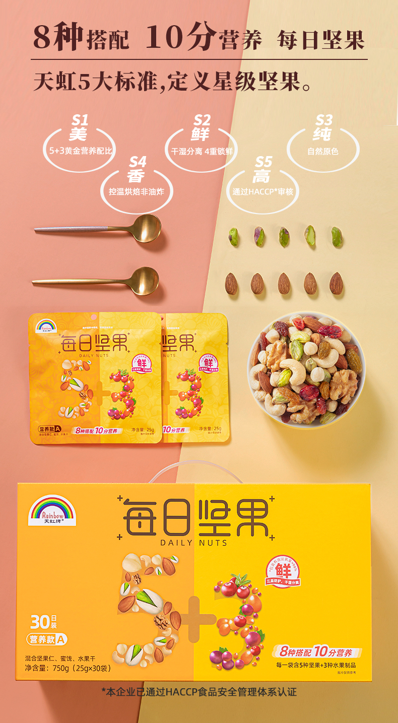 这款天虹牌 每日坚果大礼包30袋750g,5种坚果+3种果干,内含:核桃仁、开心果仁、巴旦木仁、腰果仁、榛子、曼越莓、黑加仑,5+2均衡科学配比,独特的低温烘焙工艺,轻加工,健康更美味。独立锁鲜,干湿分离,营养不串味。
