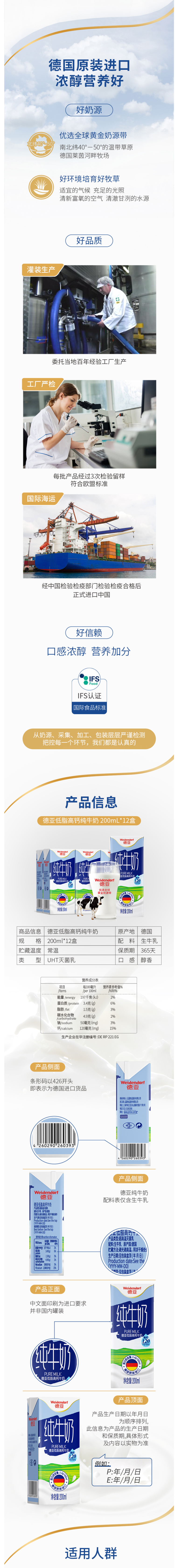 进口奶源 健康低脂。乳源来自南北纬40~50°的温带草原德国莱茵河畔牧场里的奶牛,奶香纯正浓郁,采用欧洲先进脱脂技术,脂肪含量减少50%,钙含量120mg/100ml,脂肪含量1.5g/100ml,蛋白质含量3.4g/100ml,高钙低脂更易吸收。并经IFS认证,从奶源、加工到包装一系列溯源把控,食用健康安全。