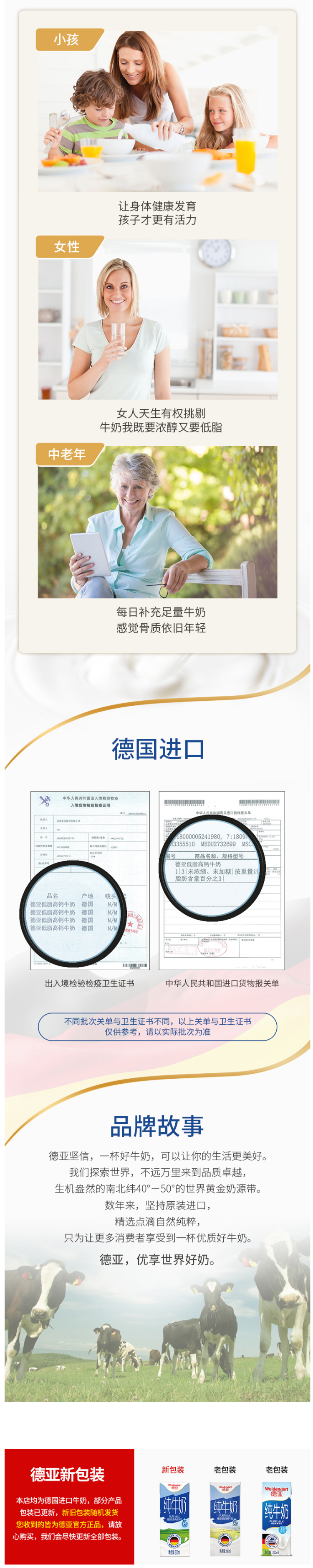 德亚牛奶由德国知名奶产品厂商Hochwald 好沃德代工生产,商品拥有国家颁发的“出入境检验检疫卫生证书”和“中国人民共和国进口货物报关单”。