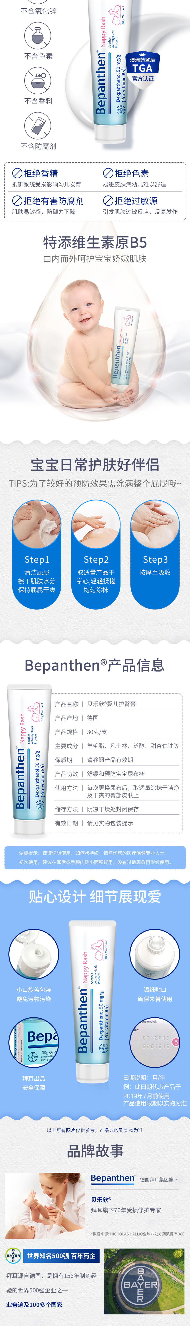 BAYER 拜耳,西方国家公认的高质量,使用安全系数较高的大品牌。这款Bayer 拜耳 Bepanthen 宝宝万用护臀膏,针对尿布疹,蚊虫叮咬,手脚皲裂,晒伤,割伤、擦伤、烫伤、效果杠杠的,简直是万用膏。支持受损肌肤愈合,可有效护理受刺激的肌肤,以及母亲哺乳期乳头皲裂或损坏。专为宝宝研发,适合宝宝娇嫩的皮肤。
