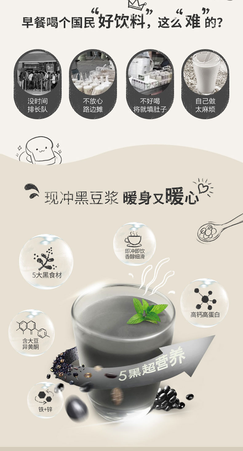这款五谷磨房 黑之养五黑豆浆粉,配方均衡,含4大营养素,铁、锌大豆异黄酮和膳食纤维,精选5大黑色食材:生长在鄱阳湖平原的黑芝麻,钙含量约为牛奶的7.3倍;东北黑大豆,圆润饱满,低温烘焙,蛋白质含量≈6个鸡蛋;黑龙江五常黑米,含多种矿物质;柴达木盆地青海黑果枸杞,原花青素含量3.24g/100g,是黑加仑的5.6倍;还有黑龙江五常的黑米、河北珍稀黑小麦,采用科学比例搭配,精细研磨而成,爱自己,喝五谷,营养与美味共存。