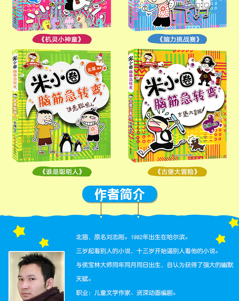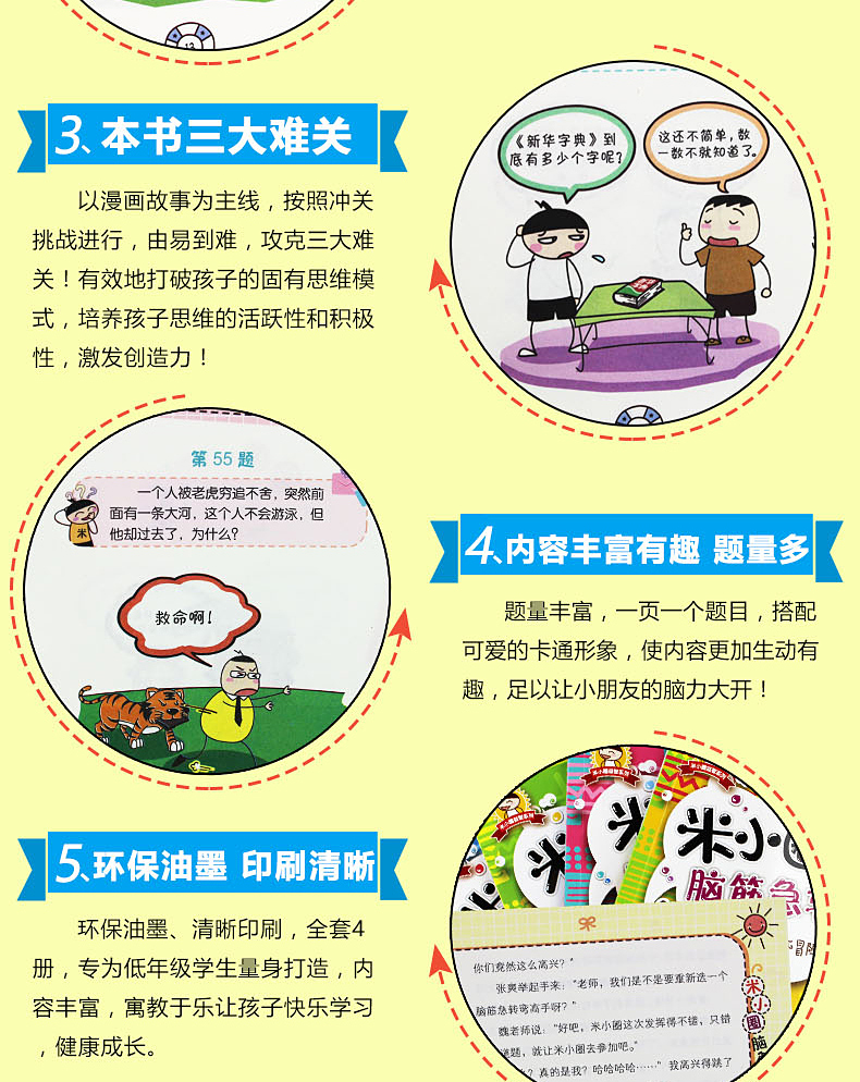 继《米小圈上学记》畅销280万册后,“米小圈”家族又添新成员——调皮可爱的米小圈有故事的《脑筋急转弯》智力大闯关。共包含《脑力挑战赛》、《机灵小神童》、《谁是聪明人》以及《古董大冒险》四本书,彩色幽默漫画,延续“米小圈”系列爆笑风格。便携本,小朋友比较方便携带。每本脑筋急转弯共设置了三关,用一个故事作为主线串联,按照冲关挑战的方式进行。 三关既环环相扣又层层递进,让小读者有体验感、场景感,鼓励小读者在阅读故事的同时,开动脑筋;在开怀大笑之余,拓展思维。