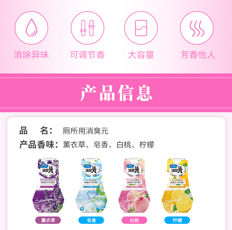 厕所用:白桃味、柠檬味、皂香味、薰衣草味;房间用:白桃味、甘菊味、玫瑰味、薰衣草味;